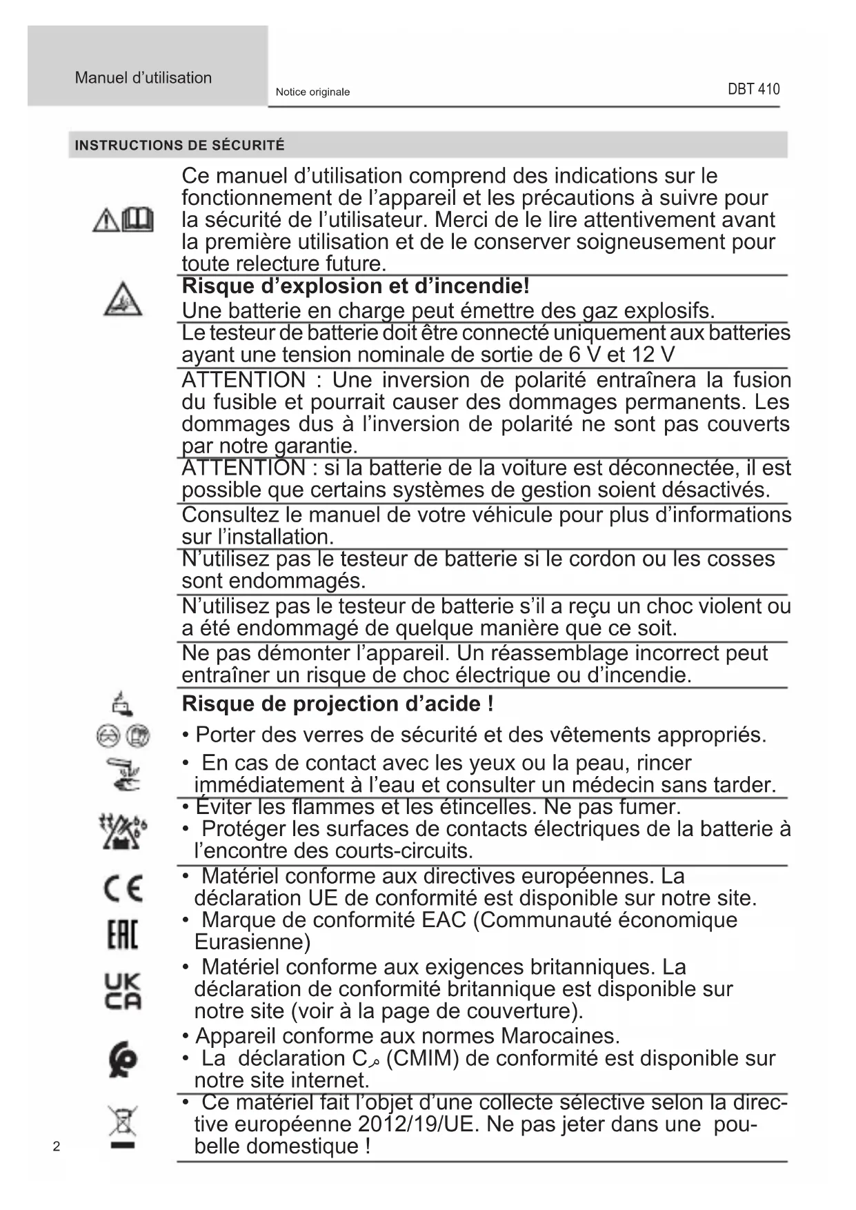 Ce manuel d’utilisation comprend des indications sur le fonctionnement de l’appareil et les précautions à suivre pour la sécurité de l’utilisateur. Merci de le lire attentivement avant la première utilisation et de le conserver soigneusement pour toute relecture future. Risque d’explosion et d’incendie! Une batterie en charge peut émettre des gaz explosifs. Le testeur de batterie doit être connecté uniquement aux batteries ayant une tension nominale de sortie de 6 V et 12 V ATTENTION : Une inversion de polarité entraînera la fusion du fusible et pourrait causer des dommages permanents. Les dommages dus à l’inversion de polarité ne sont pas couverts par notre garantie. ATTENTION : si la batterie de la voiture est déconnectée, il est possible que certains systèmes de gestion soient désactivés. Consultez le manuel de votre véhicule pour plus d’informations sur l’installation. N’utilisez pas le testeur de batterie si le cordon ou les cosses sont endommagés. N’utilisez pas le testeur de batterie s’il a reçu un choc violent ou a été endommagé de quelque manière que ce soit. Ne pas démonter l’appareil. Un réassemblage incorrect peut entraîner un risque de choc électrique ou d’incendie. Risque de projection d’acide !