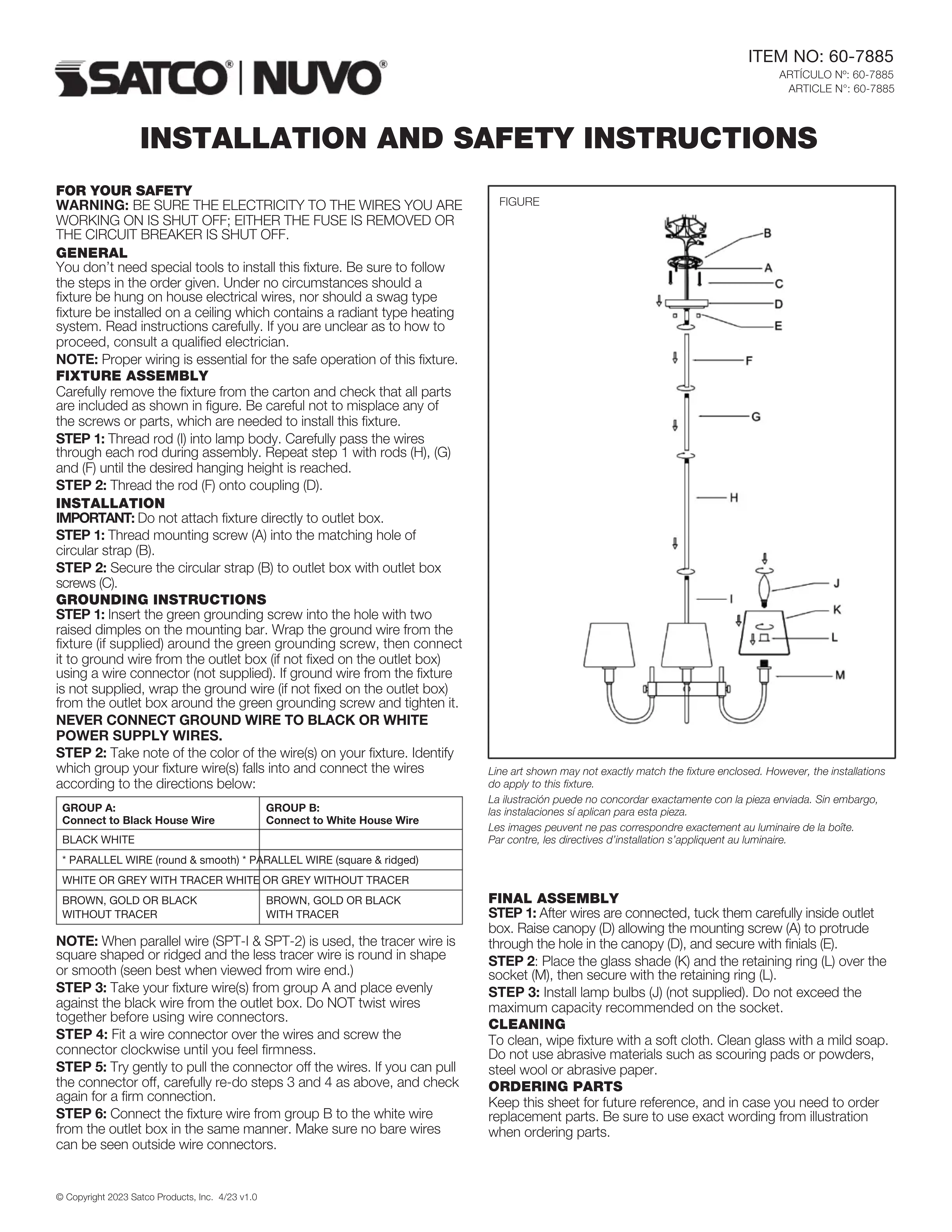 Conservez ces instructions pour une consultation ultérieure et au cas où vous auriez à commander des pièces de rechange. Assurez-vous d’utiliser les lettres exactes gurant dans l’illustration au moment de commander des pièces. ESPAÑOL: INSTRUCCIONES DE INSTALACIÓN Y SEGURIDAD ARTÍCULO Nº: 60-7885 FRANCAIS: INSTRUCTIONS SUR L’INSTALLATION ET LA SÉCURITÉ ARTICLE N°: 60-7885