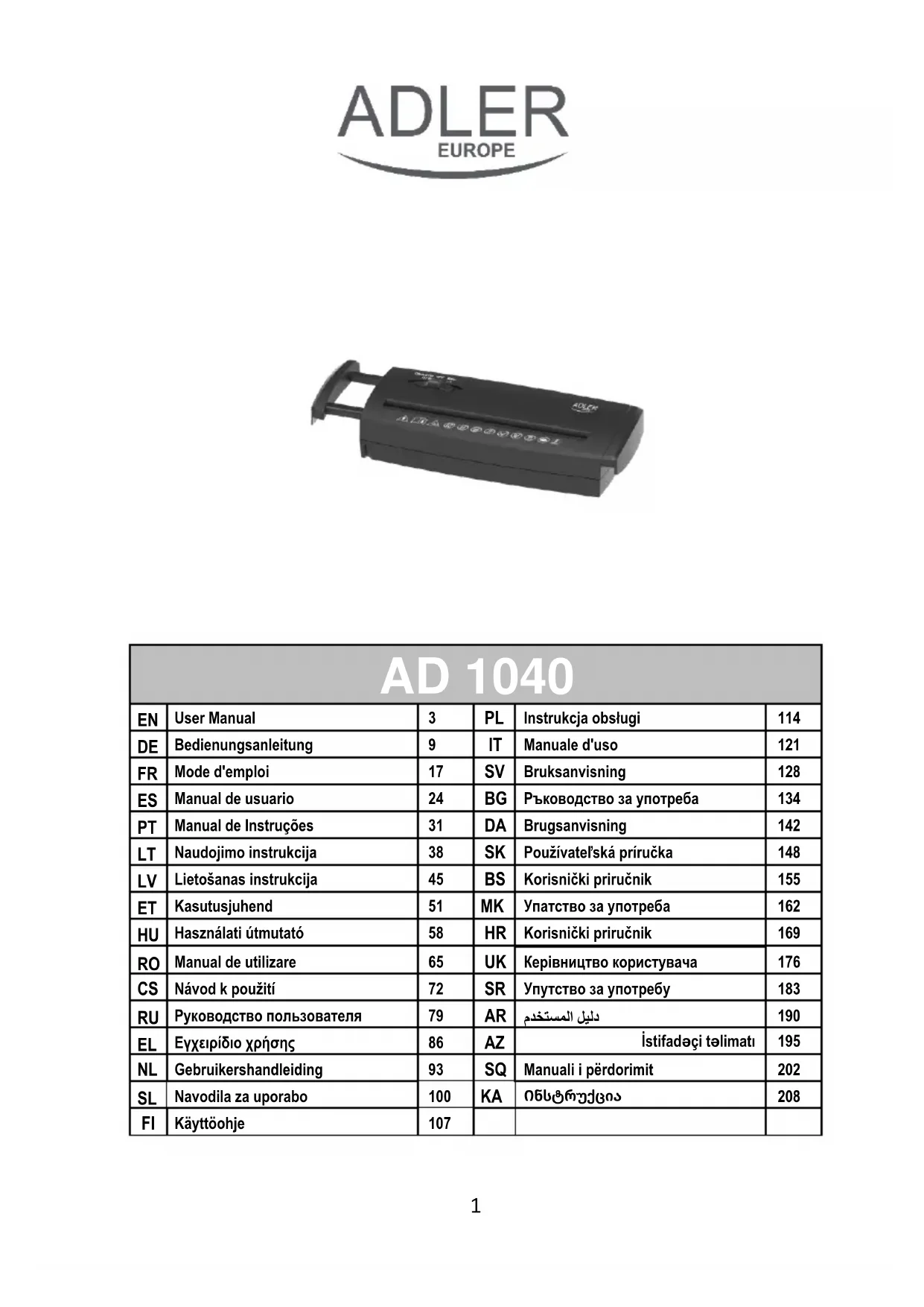 AD 1040 - Destructeur de document ADLER - Notice d'utilisation et mode d'emploi gratuit