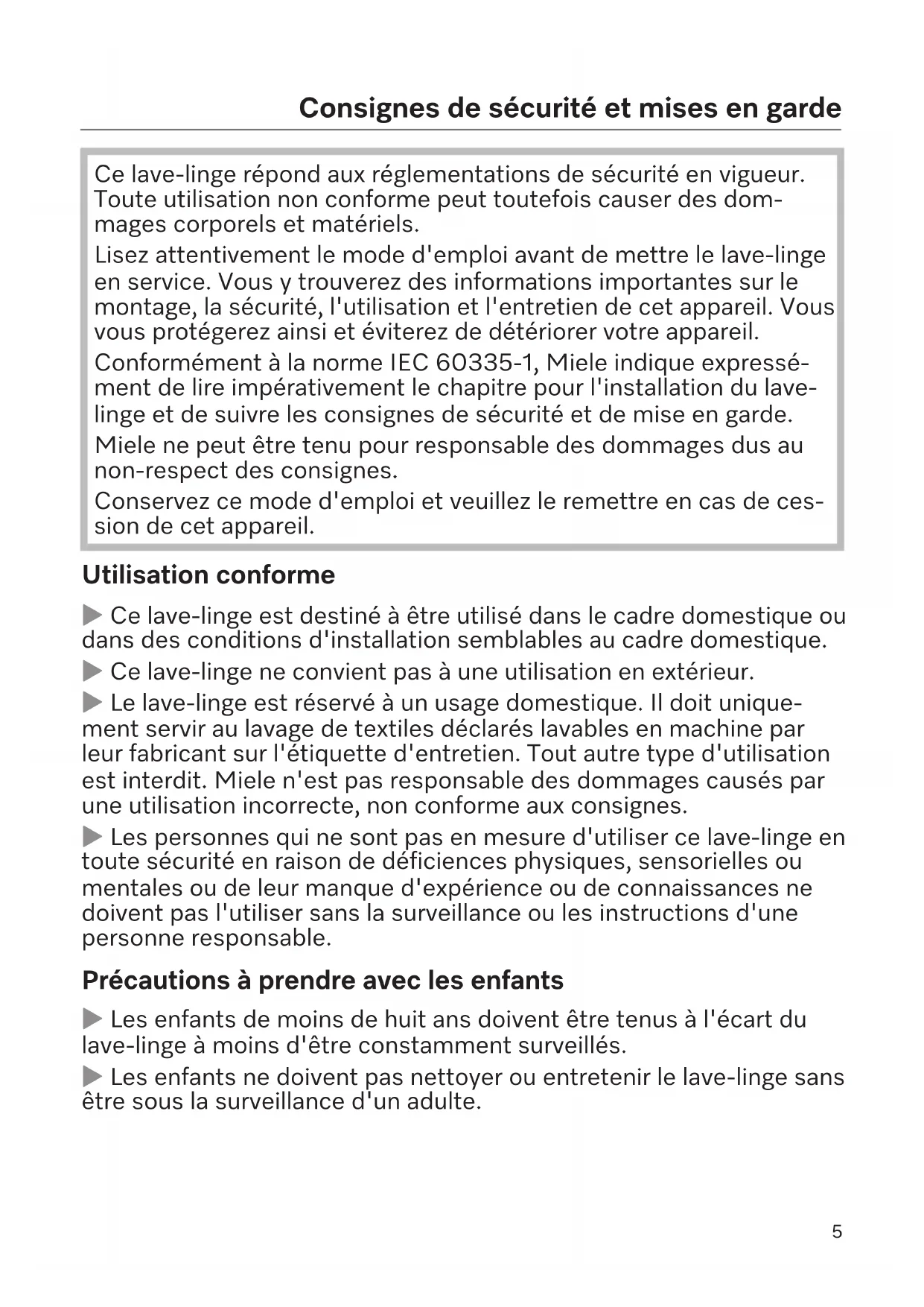 Ce lave-linge répond aux réglementations de sécurité en vigueur. Toute utilisation non conforme peut toutefois causer des dom- mages corporels et matériels. Lisez attentivement le mode d'emploi avant de mettre le lave-linge en service. Vous y trouverez des informations importantes sur le montage, la sécurité, l'utilisation et l'entretien de cet appareil. Vous vous protégerez ainsi et éviterez de détériorer votre appareil. Conformément à la norme IEC60335-1, Miele indique expressé- ment de lire impérativement le chapitre pour l'installation du lave- linge et de suivre les consignes de sécurité et de mise en garde. Miele ne peut être tenu pour responsable des dommages dus au non-respect des consignes. Conservez ce mode d'emploi et veuillez le remettre en cas de ces- sion de cet appareil. Utilisation conforme Ce lave-linge est destiné à être utilisé dans le cadre domestique ou dans des conditions d'installation semblables au cadre domestique. Ce lave-linge ne convient pas à une utilisation en extérieur. Le lave-linge est réservé à un usage domestique. Il doit unique- ment servir au lavage de textiles déclarés lavables en machine par leur fabricant sur l'étiquette d'entretien. Tout autre type d'utilisation est interdit. Miele n'est pas responsable des dommages causés par une utilisation incorrecte, non conforme aux consignes. Les personnes qui ne sont pas en mesure d'utiliser ce lave-linge en toute sécurité en raison de déficiences physiques, sensorielles ou mentales ou de leur manque d'expérience ou de connaissances ne doivent pas l'utiliser sans la surveillance ou les instructions d'une personne responsable. Précautions à prendre avec les enfants Les enfants de moins de huit ans doivent être tenus à l'écart du lave-linge à moins d'être constamment surveillés. Les enfants ne doivent pas nettoyer ou entretenir le lave-linge sans être sous la surveillance d'un adulte.Consignes de sécurité et mises en garde