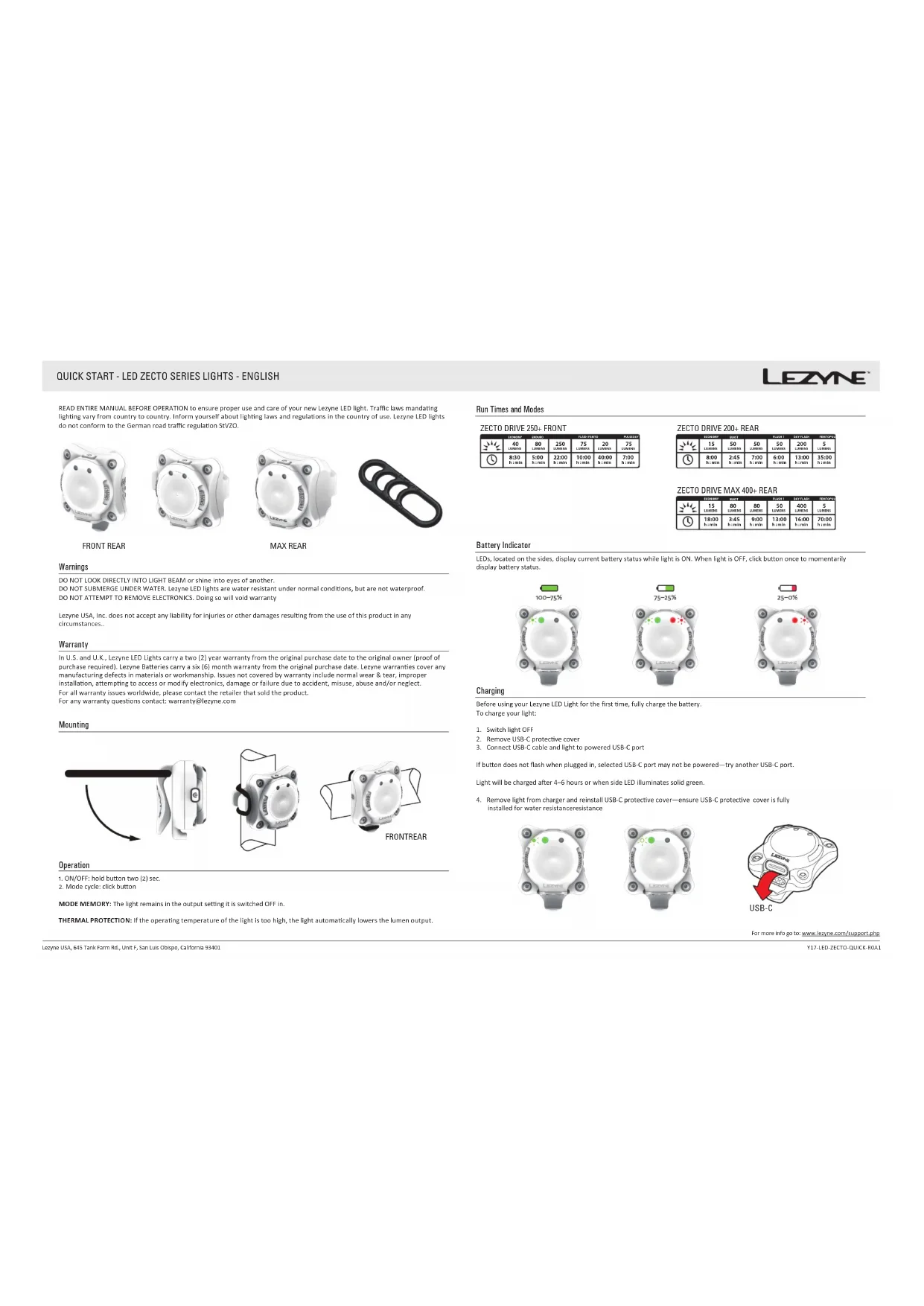 Zecto Drive 250+ - Lampe vélo Lezyne - Notice d'utilisation et mode d'emploi gratuit