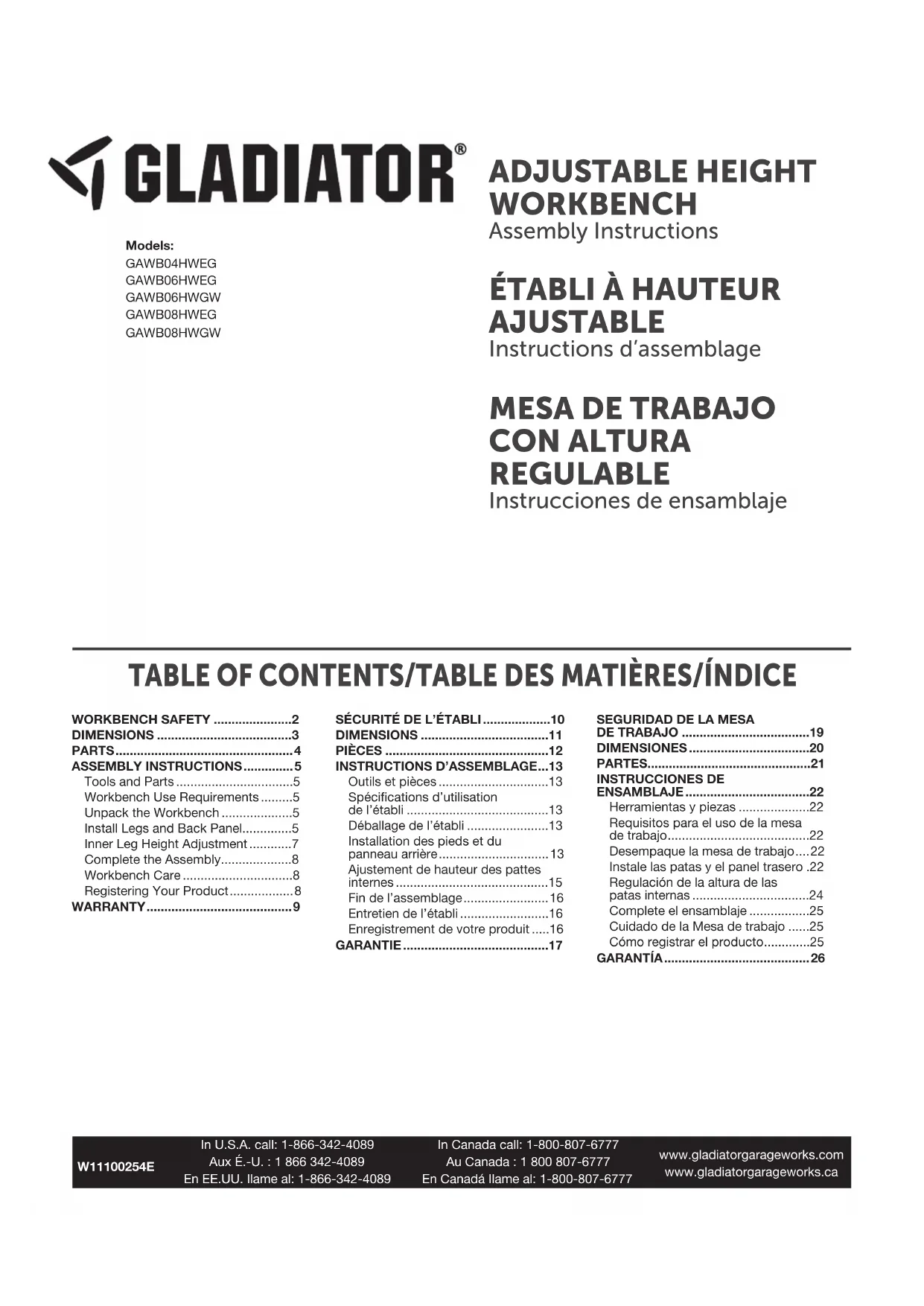 Enregistrement de votre produit Il y a plusieurs avantages à enregistrer votre produit. Pour obtenir plus de renseignements et enregistrer votre produit en ligne, consulter le www.gladiatorgarageworks.com. Les consommateurs au Canada peuvent composer le 1800807-6777. AVERTISSEMENT Risque du poids excessif Utiliser deux ou plus de personnes pour déplacer et assembler l’établi. Le non-respect de cette instruction peut causer une blessure au dos ou d'autre blessure.GARANTIE DE L’ÉTABLI GLADIATOR