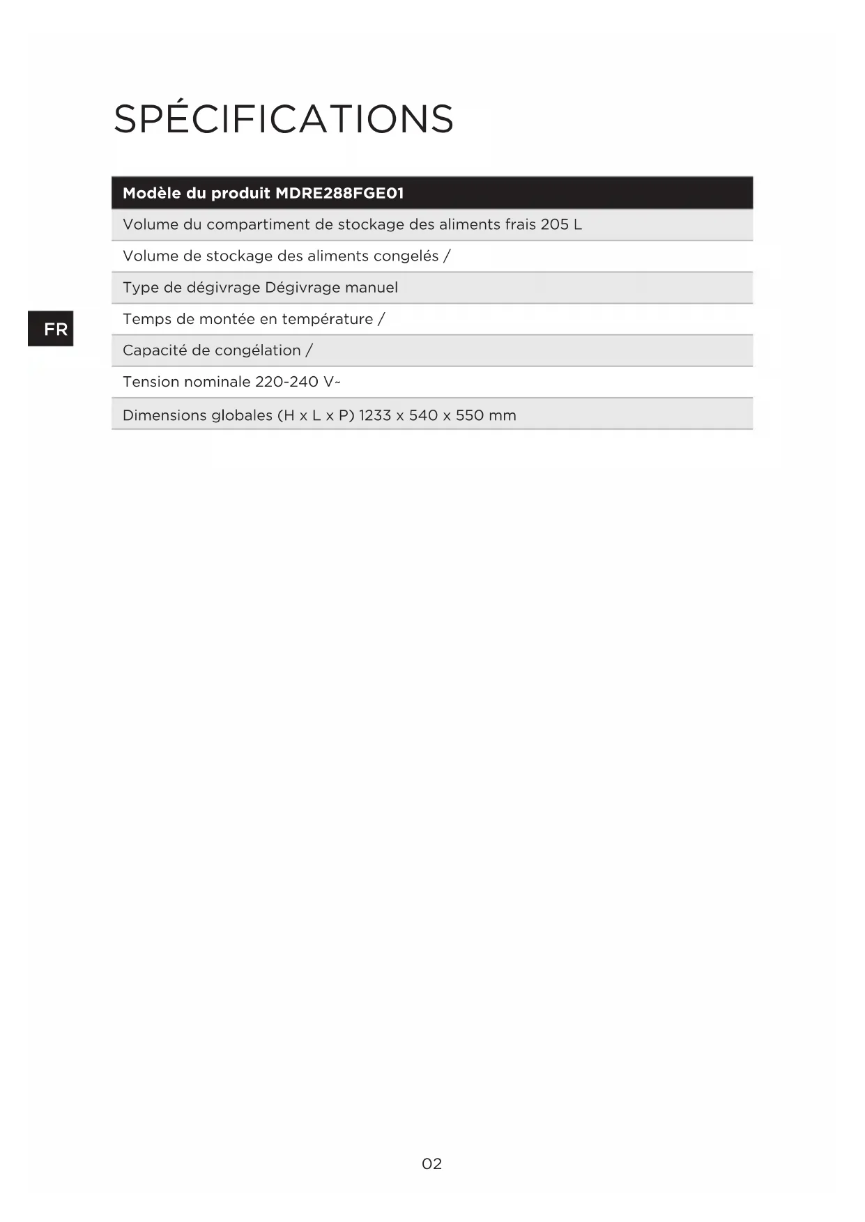 Nous vous remercions d’avoir choisi Midea ! Avant d’utiliser votre nouveau produit Midea, veuillez lire attentivement ce manuel afin de vous assurer que vous savez comment utiliser les caractéristiques et les fonctions de votre nouvel appareil en toute sécurité. FR02 SPÉCIFICATIONS Modèle du produit MDRE288FGE01 Volume du compartiment de stockage des aliments frais 205 L Volume de stockage des aliments congelés / Type de dégivrage Dégivrage manuel Temps de montée en température / Capacité de congélation / Tension nominale 220-240 V~