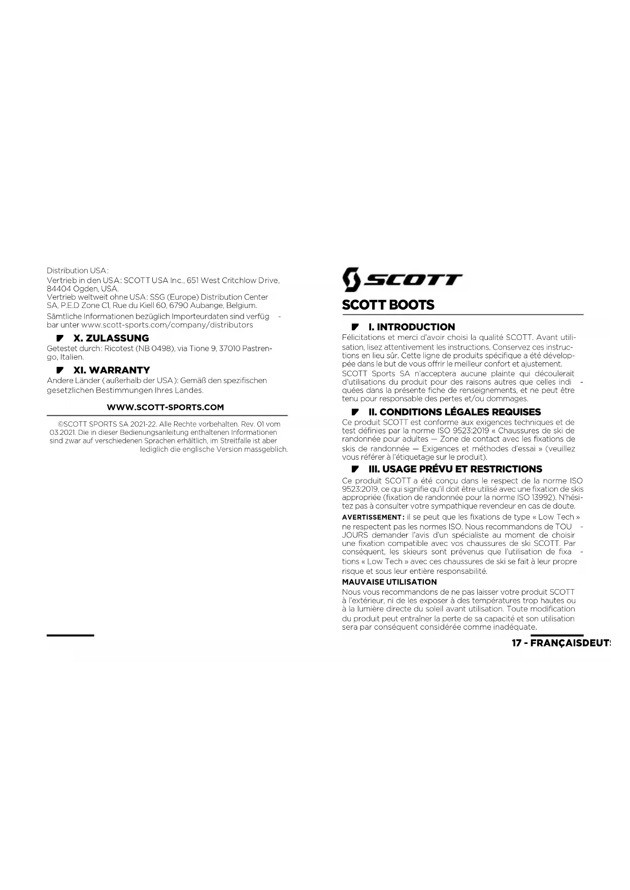 - III. USAGE PRÉVU ET RESTRICTIONS Ce produit SCOTT a été conçu dans le respect de la norme ISO 9523:2019, ce qui signifie qu’il doit être utilisé avec une fixation de skis appropriée (fixation de randonnée pour la norme ISO 13992). N’hési