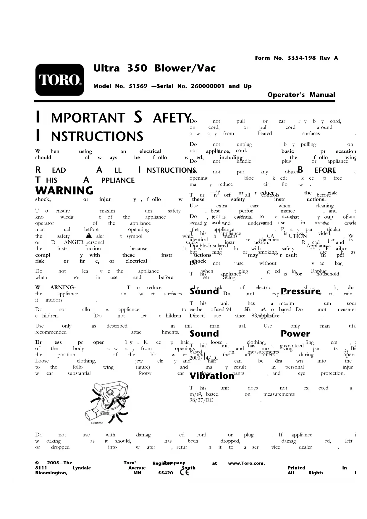 ATTENTION —R espectez ces consignes de sécurité pour réduir e le risque d'incendie, d'électr ocution ou de blessur es. P our assurer le maxim um de sécurité et de rendement et bien connaître le produit, il est essentiel que v ous -même et tout autre utilisateur de la mac hine lisiez et compreniez le conten u de ce guide a v ant de mettre le moteur en marc he . F aites par ticulièrement attention aux symboles de sécurité qui signifient PR UDENCE, A TTENTION ou D ANGER et concer nent la sécurité des personnes . V eillez à lire et bien comprendre ces directi v es qui por tent sur v otre sécurité. Ne pas les r especter , c'est risquer de v ous blesser , parf ois mor tellement. Ne laissez pas l'appareil sans sur v eillance quand il est sous tension. Débranc hez -le du secteur quand il ne ser t pas et a v ant tout entretien. ATTENTION – P our réduire le risque d'électrocution, n'utilisez pas l'appareil sur des surfaces humides et ne l'exposez pas à la pluie . Rang ez -le à l'intérieur . L'appareil n'est pas un jouet. Ne l'utilisez pas quand des enfants sont à pro ximité. N'autorisez pas les enfants à l'utiliser . R espectez les instr uctions d'utilisation du présent man uel. N'utilisez que les accessoires préconisés par le fabricant. P or tez des vêtements adéquats. N'approc hez pas les c hev eux, les doigts ou autres par ties du cor ps , ni les vêtements amples , des ouv er tures et des pièces mobiles . Sac hez où se trouv ent le souffleur et les entrées d'air pendant le fonctionnement de l'appareil. Les vêtements amples , les bijoux et les c hev eux peuv ent être aspirés dans les entrées d'air (v oir la figure sui v ante) et v ous risquez de v ous blesser . P or tez toujours des c haussures solides , un pantalon et des lunettes de protection. N'utilisez pas l'appareil si le cordon d'alimentation ou la prise sont endommagés . Si l'appareil ne fonctionne pas cor rectement, s’il est tombé, a été endommagé, oublié dehors ou immergé dans l'eau, ren v o yez -le à un réparateur ag réé. Évitez de tirer ou de soulev er l'appareil par le cordon d'alimentation, d’utiliser le cordon comme poignée , de coincer le cordon dans une por te ou de le traîner sur des arêtes tranc hantes ou des angles vifs . N'approc hez pas le cordon des surfaces c haudes . Ne débranc hez pas l'appareil en tirant sur le cordon, mais en tenant la prise . Ne manipulez pas l'appareil ou la prise si v ous a v ez les mains mouillées . N'introduisez rien dans les ouv er tures . N'utilisez pas l'appareil si les ouv er tures sont bloquées ; ne laissez pas s'accum uler la poussière , les peluc hes , les c hev eux ou quoi que ce soit d'autre susce ptible de gêner la circulation de l'air . Coupez toutes les commandes a v ant de débranc her l'appareil. So yez par ticulièrement pr udent lorsque v ous netto yez sur un escalier . N'aspirez pas de liquides inflammables ou combustibles , comme de l'essence , et n'utilisez pas l'appareil dans des endroits où ce type de liquide peut se trouv er . L'appareil bénéficie d'une double isolation. Utilisez uniquement des pièces de rec hang e identiques . R e por tez -v ous aux instr uctions d'entretien des Appareils à double isolation. N'aspirez pas d'objets incandescents ou qui dég ag ent de la fumée , tels cig arettes , allumettes ou cendres c haudes . N'utilisez pas l'appareil sans le sac ou les accessoires cor rects . Cet appareil est réser vé à l'usag e domestique . Pression acoustique Cette mac hine produit au ni v eau de l'oreille de l'utilisateur une pression acoustique maximale de 94 dB A, d'après des mesures effectuées sur des mac hines identiques selon la Directi v e 98/37/CE.© 2005—The Toro® Company8111 Lyndale Avenue SouthBloomington, MN 55420 Enregistrez votre produit à www.Toro.com Traduction du texte d'origine (FR) Imprimé aux États -Unis.Tous droits réservésPuissance acoustique Cette mac hine a un ni v eau de puissance acoustique g aranti de 101 dB A, d'après des mesures effectuées sur des mac hines identiques selon la Directi v e 2000/14/CE. Niveau de vibrations Cette mac hine expose les mains et les bras à un ni v eau de vibrations maxim um de 4,13 m/s