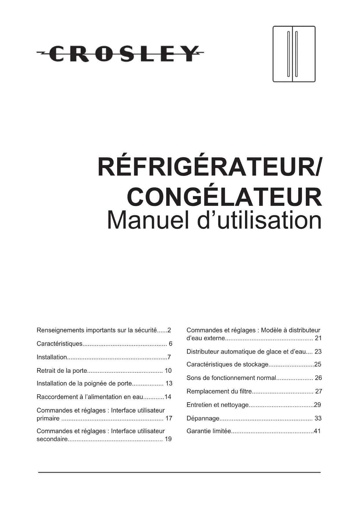 - Garantie limitée Bienvenue au sein de notre famille Merci d’accueillir Crosley chez vous! Nous considérons votre achat comme le début d’une longue relation. Ce manuel vous aidera à utiliser et à entretenir votre produit. Veuillez le lire avant d’utiliser votre appareil. Gardez-le à portée de main pour le consulter rapidement. En cas de problème, la section Dépannage vous aidera à résoudre les problèmes les plus courants. La FAQ, des conseils et des vidéos utiles, des produits de nettoyage et des accessoires pour la cuisine et la maison sont disponibles sur http://www.frigidaire.com. Nous sommes là pour vous! Visitez notre site Web, discutez avec un agent ou appelez-nous si vous avez besoin d’aide. Nous pourrons peut-être vous aider à éviter une visite du service après-vente. Si vous avez besoin d’un service, nous pouvons le mettre en place pour vous. Officialisons les choses! N’oubliez pas d’enregistrer votre produit. Conservez ces renseignements pour référence rapide Numéro de modèle p. 41
