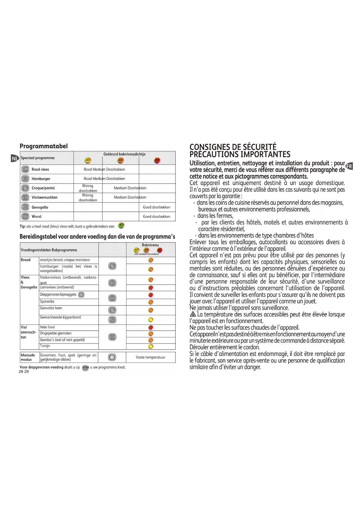 - Appuyez sur le bouton marche/arrêt et relancez le mode manuel. Guide de dépannage Conseil, notamment pour la viande : les résultats de cuisson des programmes prédéfinis peuvent varier selon l’origine, la coupe et la qualité de l’aliment à cuire, les programmes ayant été définis et testés avec des aliments de bonne qualité. De même l’épaisseur de la viande étant prise en compte lors de la cuisson, vous ne pourrez pas cuire des aliments d’une épaisseur supérieure à 4 cm. Aliments Programme de cuisson Niveau de cuisson Pain Tranches de pain, croque monsieur Hamburger : (après cuisson préal- able de la viande) Viande & Volaille Porc (désossé), poitrine de porc Agneau (désossé) Aiguillettes de poulet congelées Poitrine de porc Tranche de jambon à cuire Poitrine de poulet marinée magret de canard Poisson Truite entière Crevettes non décortiquées Gambas (décortiquées ou non) Thon Tableau de cuisson pour aliments hors programmes saignant à point bien cuit Mode manuel Légumes grillés... (épaisseurs fines et constantes) Température fixe Programme dédié Indicateur de couleur du niveau de cuisson Viande rouge Saignant A point Bien cuit Steak haché Saignant A point Bien cuit Panini Légèrement cuit Bien cuit Croustillant Poisson A point Bien cuit Volaille Cuit à point Porc/saussices/agneau Cuit à point Tableau des programmes Conseil : si vous souhaitez de la viande très saignante (bleue),vous pouvez ouvrir au niveau : Pour les aliments surgelés, appuyez sur avant de sélectionner votre programme.42 43