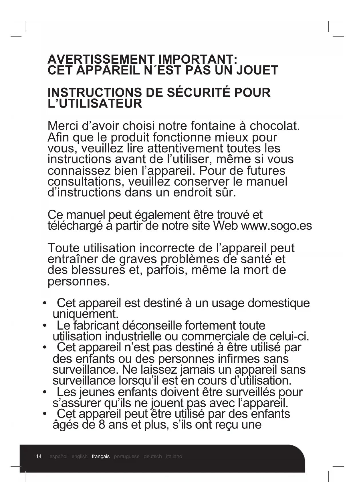 L’UTILISATEUR Merci d’avoir choisi notre fontaine à chocolat. An que le produit fonctionne mieux pour vous, veuillez lire attentivement toutes les instructions avant de l’utiliser, même si vous connaissez bien l’appareil. Pour de futures consultations, veuillez conserver le manuel d’instructions dans un endroit sûr. Ce manuel peut également être trouvé et téléchargé à partir de notre site Web www.sogo.es Toute utilisation incorrecte de l’appareil peut entraîner de graves problèmes de santé et des blessures et, parfois, même la mort de personnes.