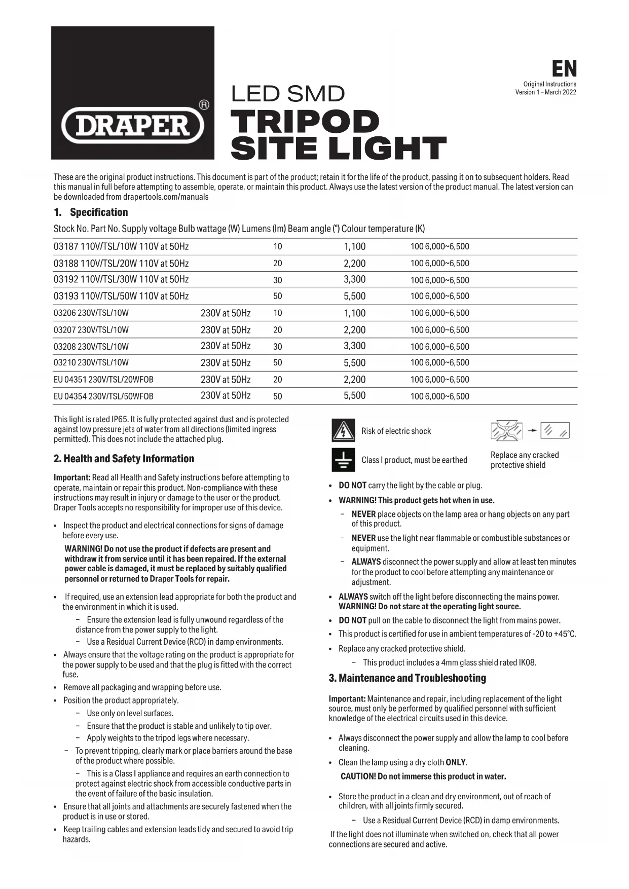 Important : Lisez toutes les instructions d’hygiène et de sécurité avant d'essayer d'utiliser, d'entretenir ou de réparer ce produit. Le non-respect de ces instructions peut entraîner des blessures ou des dommages pour l'utilisateur ou le produit. Draper Tools décline toute responsabilité en cas d'utilisation incorrecte de cet appareil.• Avant chaque utilisation, inspectez le produit et les connexions électriques pour détecter tout signe de dommage.AVERTISSEMENT ! N'utilisez pas le produit s'il présente des défauts et ne l’utilisez pas jusqu'à ce qu'il ait été réparé. Si le câble d'alimentation externe est endommagé, il doit être remplacé par un personnel qualié ou renvoyé à Draper Tools pour réparation. Si nécessaire, utilisez une rallonge adaptée au produit et à l'environnement dans lequel il est utilisé. − Veillez à ce que la rallonge soit entièrement déroulée, quelle que soit la distance entre l'alimentation électrique et le luminaire.− Utilisez un dispositif à courant résiduel (RCD) dans les environnements humides.• Veillez toujours à ce que la tension indiquée sur le produit corresponde à l'alimentation électrique utilisée et à ce que la che soit équipée du bon fusible.• Retirez tous les emballages et conditionnements avant l'utilisation.• Positionnez le produit de manière appropriée.− Utilisez le produit uniquement sur des surfaces planes.− Assurez-vous que le produit est stable et ne risque pas de se renverser.− Apposez des poids sur les pieds du trépied si nécessaire.− Pour éviter de trébucher, marquez clairement ou placez des barrières autour de la base du produit lorsque cela est possible.− Cet appareil est un appareil de classe I et nécessite une connexion à la terre pour se protéger contre les chocs électriques provenant de parties conductrices accessibles en cas de défaillance de l'isolation de base.• Veillez à ce que tous les joints et accessoires soient solidement xés lorsque le produit est utilisé ou stocké.• Gardez les câbles et les rallonges bien rangés et sécurisés pour éviter les risques de trébuchement.• NE TRANSPORTEZ PAS la lampe par le câble ou la che.• AVERTISSEMENT ! Le dispositif chaue lorsqu'il est utilisé. − Ne posez JAMAIS d'objets sur la zone du luminaire et ne suspendez jamais d'objets à aucune partie de ce produit.− N’UTILISEZ JAMAIS le luminaire à proximité de substances ou d'équipements inammables ou combustibles. − Débranchez TOUJOURSl'alimentation électrique et laissez le dispositif refroidir pendant au moins dix minutes avant de procéder à tout entretien ou réglage.