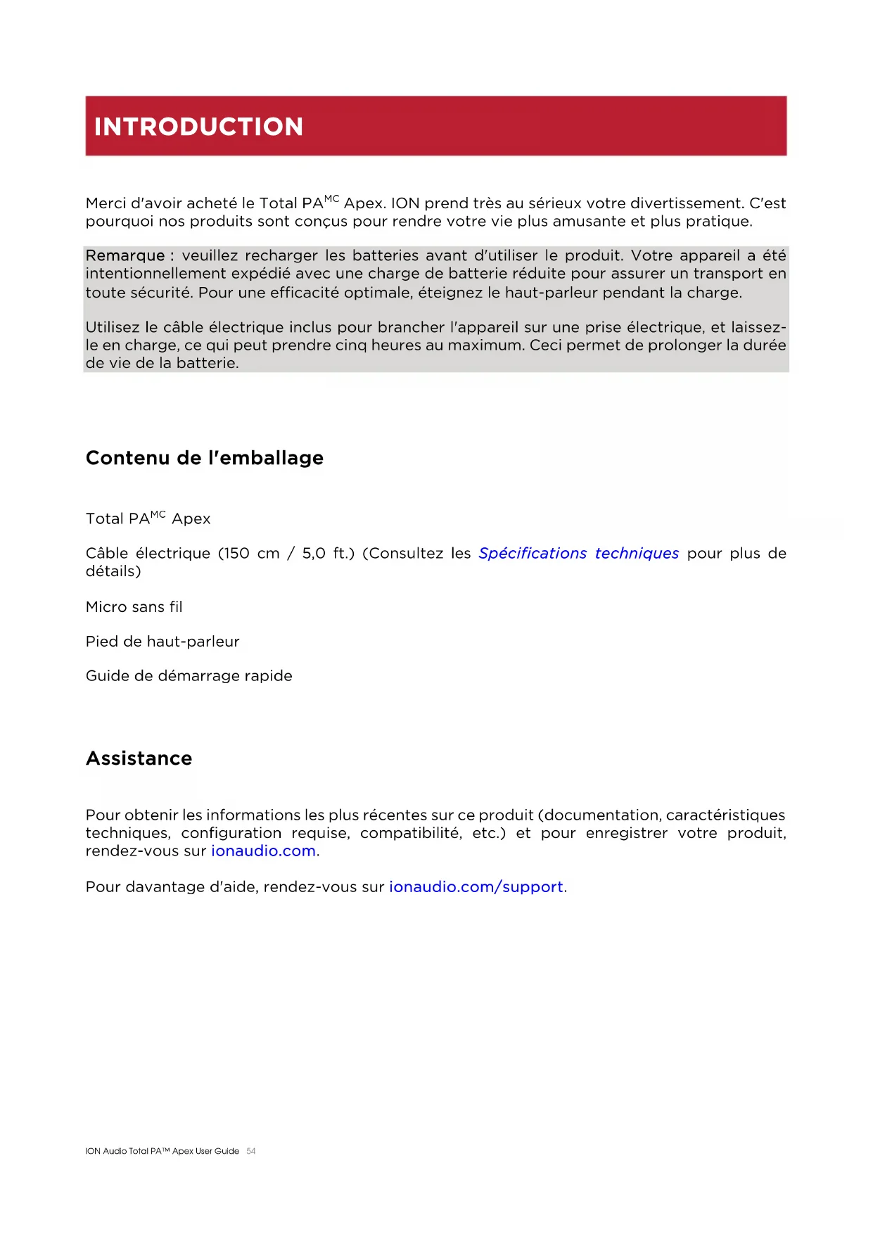 Apex. ION prend très au sérieux votre divertissement. C'est pourquoi nos produits sont conçus pour rendre votre vie plus amusante et plus pratique. Remarque : veuillez recharger les batteries avant d'utiliser le produit. Votre appareil a été intentionnellement expédié avec une charge de batterie réduite pour assurer un transport en toute sécurité. Pour une efficacité optimale, éteignez le haut-parleur pendant la charge. Utilisez le câble électrique inclus pour brancher l'appareil sur une prise électrique, et laissez- le en charge, ce qui peut prendre cinq heures au maximum. Ceci permet de prolonger la durée de vie de la batterie.