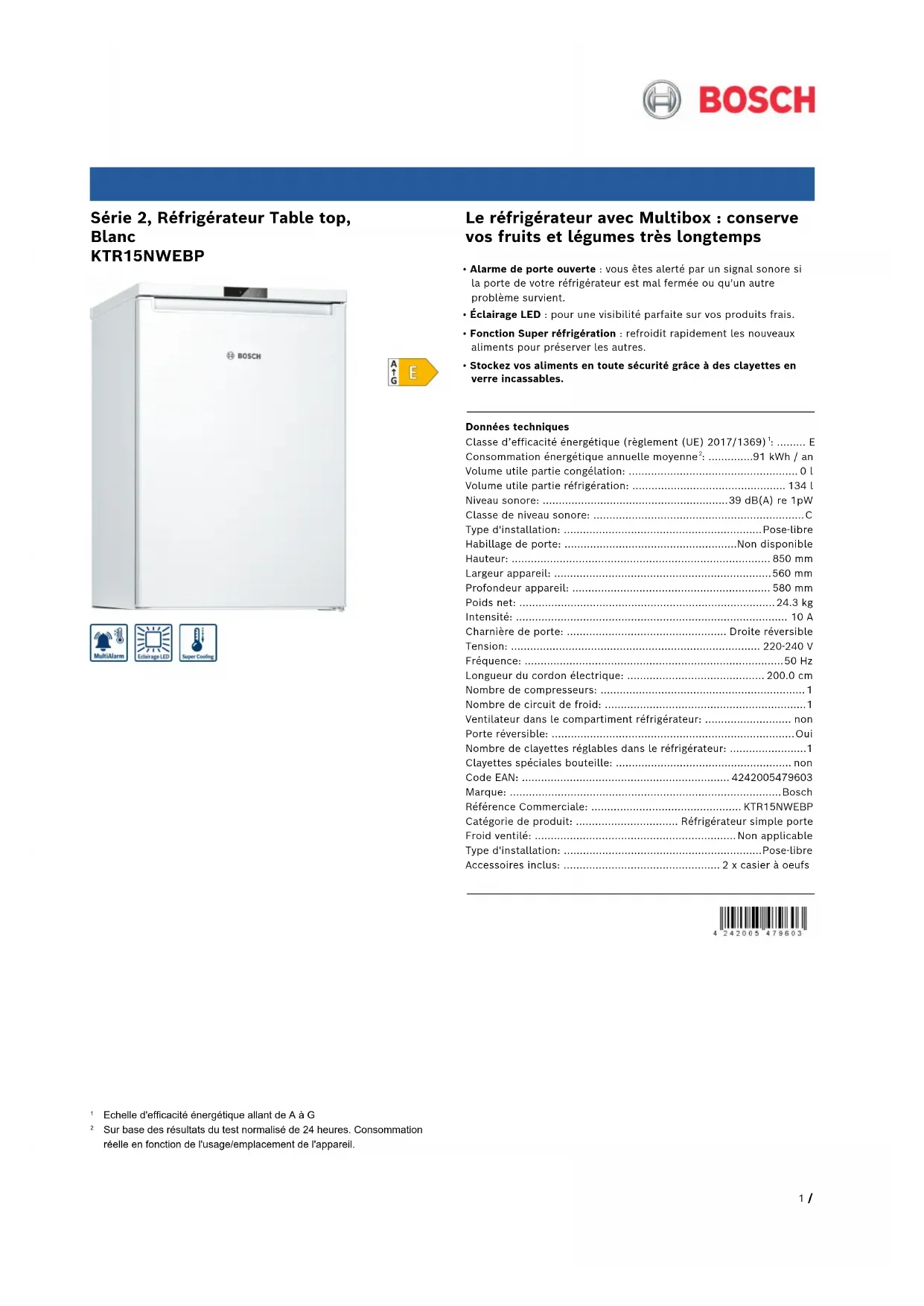 - Stockez vos aliments en toute sécurité grâce à des clayettes en verre incassables. Données techniques Classe d’efficacité énergétique (règlement (UE) 2017/1369)
