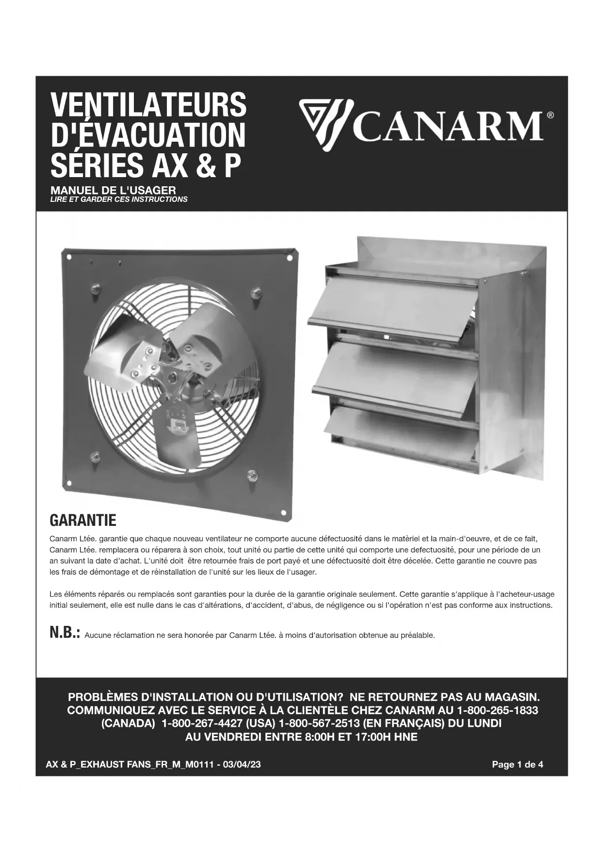 GARANTIE Canarm Ltée. garantie que chaque nouveau ventilateur ne comporte aucune défectuosité dans le matèriel et la main-d'oeuvre, et de ce fait, Canarm Ltée. remplacera ou réparera à son choix, tout unité ou partie de cette unité qui comporte une defectuosité, pour une période de un an suivant la date d'achat. L'unité doit être retournée frais de port payé et une défectuosité doit être décelée. Cette garantie ne couvre pas les frais de démontage et de réinstallation de l'unité sur les lieux de l'usager. Les éléments réparés ou remplacés sont garanties pour la durée de la garantie originale seulement. Cette garantie s'applique à l'acheteur-usage initial seulement, elle est nulle dans le cas d'altérations, d'accident, d'abus, de négligence ou si l'opération n'est pas conforme aux instructions. N.B.: Aucune réclamation ne sera honorée par Canarm Ltée. à moins d'autorisation obtenue au préalable. PROBLÈMES D'INSTALLATION OU D'UTILISATION? NE RETOURNEZ PAS AU MAGASIN. COMMUNIQUEZ AVEC LE SERVICE À LA CLIENTÈLE CHEZ CANARM AU 1-800-265-1833 (CANADA) 1-800-267-4427 (USA) 1-800-567-2513 (EN FRANÇAIS) DU LUNDI AU VENDREDI ENTRE 8:00H ET 17:00H HNE AX & P_EXHAUST FANS_FR_M_M0111 - 03/04/23 Page 1 de 4AX & P_EXHAUST FANS_FR_M_M0111 - 03/04/23 Page 2 de 4 MODE D'EMPLOI DU VENTILATEUR D'ÉVACUATION STANDARD VEUILLEZ LIRE LES INSTRUCTIONS SUIVANTES AVANT DE PROCÉDER À L'INSTALLATION ET GARDEZ CE MANUEL COMME RÉFÉRENCE Félicitations sur l'achat de votre ventilateur d'évacuation mural à entraînement direct de qualité. Tous ces modéles comportent un moteur fermé à avec une protection thermique contre la surcharge. Les moteurs à vitesse variable sont hautement efficaces et consomment peu d'énergie et de plus, ils peuvent être opérés comme un moteur à vitesse simple. Les moteurs sont soutenus par une monture de moteur trés robuste en tiges d'acier soudées de haut calibreet sont revÍtues d'un fini Zinc Brillant. Les ventilateurs vous sont livrés tout assemblé et 100% de nos ventilateurs sont testés avant la livraison. Celui-ci est un mode d’emploi général décrivant nos ventilateurs à une vitesse, deux vitesses et à vitesse variable ainsi que notre ventilateur à une vitesse anti-explosif. VENTILATEUR STANDARD Ces modéles portent un boîtier robuste en acier soudé avec un fini poudré ainsi que des volets en aluminium ou en plastique qui sont retenus par des douilles en nylon de longue durée. Les volets s'ouvrent automatiquement lorsque le ventilateur démarre et se ferment lorsqu'il s'arrête. P SERIES FANS: La série P est un ventilateur d'extraction monté sur panneau solidement construit avec une finition enduite de poudre durable.