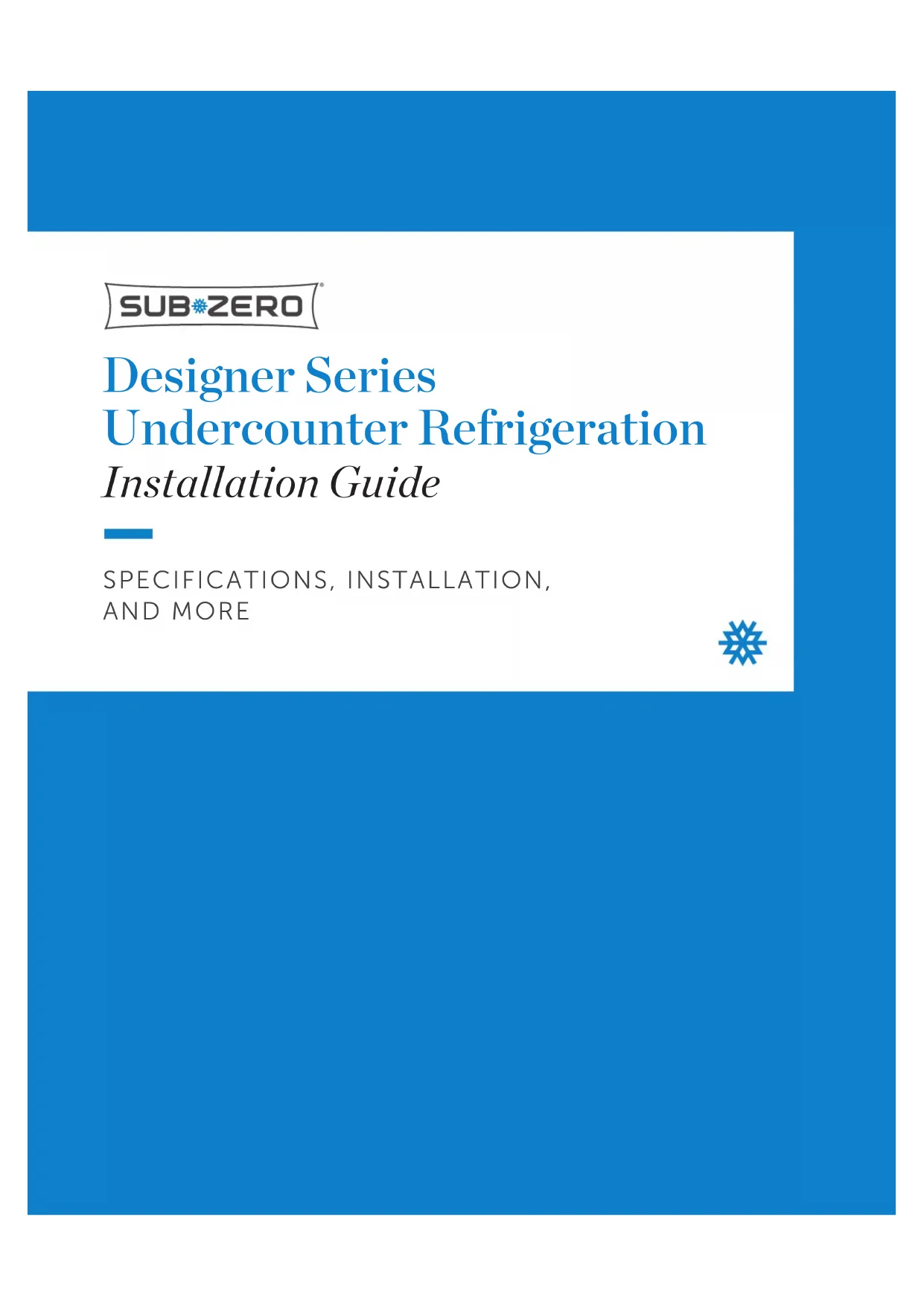 AJUSTAMIENTO TORNILLO IMÁN Ajuste del zócalo Instalación del zócalosubzero.com | 15 Instalación Finalización ADVERTENCIA Siga todas las leyes estatales y locales para almacenar, reciclar o desechar los refrigeradores y congeladores no utilizados. Sub-Zero, Sub-Zero & Design, Sub-Zero & Snowflake Design, Dual Refrigeration, The Living Kitchen, Great American Kitchens The Fine Art of Kitchen Design, Wolf, Wolf & Design, Wolf Gourmet, W & Design, perillas de color rojo, Cove, and Cove & Design son marcas registradas y marcas de servicio de Sub-Zero Group, Inc. y sus asociados. Todas las demás marcas registradas son propiedad de sus dueños respectivos en los Estados Unidos y otros países.2 | Service à la clientèle de Sub-Zero 800.222.7820 Réfrigération sous le comptoir série Concepteur Table des matières 3 Réfrigération sous le comptoir série Concepteur 4 Dimensions de l’ouverture 5 Exigences électriques 6 Exigences de plomberie 6 Préparation 7 Installation du support antibasculement 7 Butée de porte de 90° 8 Emplacement 8 Alignement 9 Conduite d’alimentation en eau 10 Panneau de porte 12 Installation du panneau 14 Achèvement Les caractéristiques et les spécifications peuvent être modifiées en tout temps sans préavis. Visitez subzero.com/ specs pour obtenir les renseignements les plus récents. Remarque importante Pour s’assurer que ce produit est installé et utilisé en toute sécurité et aussi ecacement que possible, prenez note des types de renseignement mis en évidence tout au long de ce guide : REMARQUE IMPORTANTE met en évidence des renseignements qui sont particulièrement importants. MISE EN GARDE indique une situation où une blessure mineure ou des dommages au produit peuvent se produire si les directives ne sont pas respectées. AVERTISSEMENT décrit un danger qui peut causer une blessure grave ou la mort si les précautions ne sont pas respectées. REMARQUE IMPORTANTE : Tout au long de ce guide, les dimensions entre parenthèses sont en millimètres à moins d’indication contraire. REMARQUE IMPORTANTE : Conservez ces directives pour l’inspecteur en électricité local.subzero.com | 3 Réfrigération sous le comptoir série Concepteur Renseignements sur le produit Des renseignements importants sur le produit, y compris les numéros de modèle et de série, se trouvent sur la plaque signalétique du produit. La plaque signalétique est située à l’intérieur de l’armoire dans la zone supérieure gauche de l’unité. Reportez-vous à l’illustration ci-dessous. Si vous avez besoin de service, communiquez avec le service Sub-Zero certifié par l’usine avec les numéros de modèle et de série. Pour obtenir le nom du centre de service Sub-Zero certifié par l’usine le plus près de chez vous ou si vous avez des questions concernant l’installation, consultez la section Assistance produits de notre site Web, subzero.com, ou appelez le service à la clientèle de Sub-Zero au 800-222-7820.