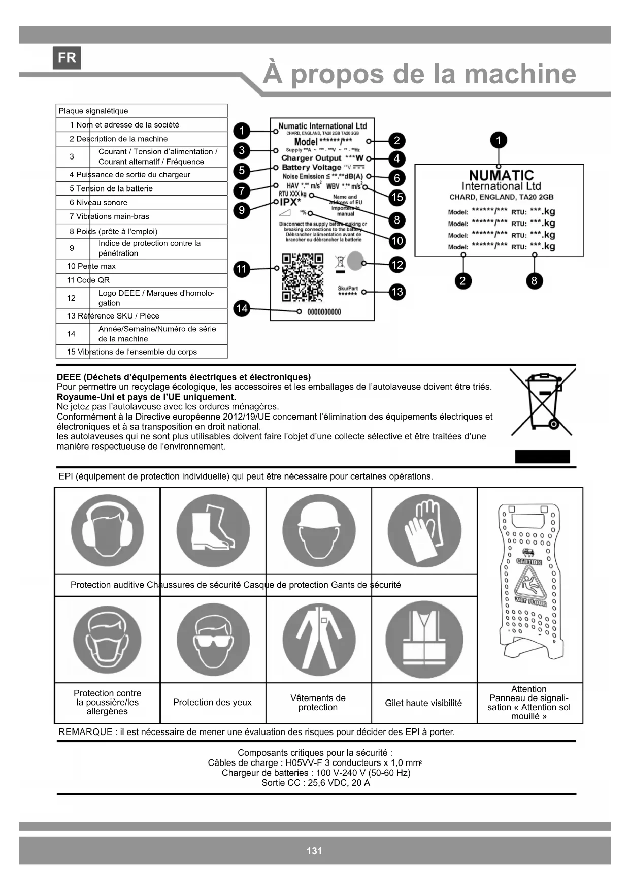 Chargeur de batteries : 100 V-240 V (50-60 Hz) Sortie CC : 25,6 VDC, 20 A Plaque signalétique1 Nom et adresse de la société2 Description de la machine Courant / Tension d’alimentation / Courant alternatif / Fréquence4 Puissance de sortie du chargeur5 Tension de la batterie6 Niveau sonore7 Vibrations main-bras8 Poids (prête à l'emploi) Indice de protection contre la pénétration10 Pente max11 Code QR Logo DEEE / Marques d'homolo-gation13 Référence SKU / Pièce Année/Semaine/Numéro de série de la machine15 Vibrations de l’ensemble du corps Protection auditive Chaussures de sécurité Casque de protection Gants de sécurité Protection contre la poussière/les allergènes Protection des yeux Vêtements de protection Gilet haute visibilité Attention Panneau de signali- sation « Attention sol mouillé » EPI (équipement de protection individuelle) qui peut être nécessaire pour certaines opérations. REMARQUE : il est nécessaire de mener une évaluation des risques pour décider des EPI à porter.
