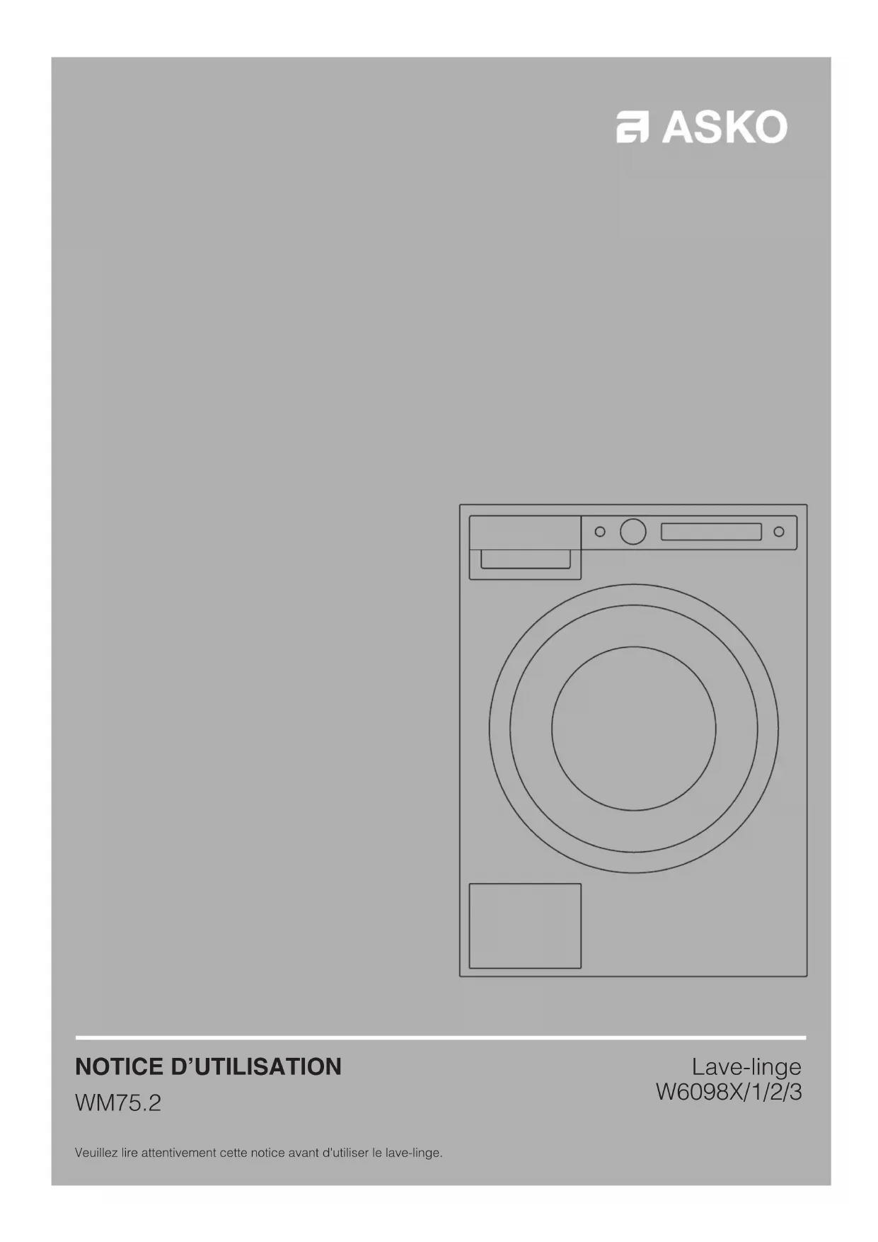 WM75.2 Veuillez lire attentivement cette notice avant d'utiliser le lave-linge. Lave-linge W6098X/1/2/32 Consignes de sécurité 3 Description du lave-linge 6 Tiroir à produits lessiviels 6 Avant d'utiliser l'appareil pour la première fois 7 Installation et raccordement 10 Conseils préliminaires au lavage 17 Les étapes du lavage (1 à 8) 20 Réglages 32 Fonctions spéciales 37 Notice originale Voir Guide de mise en service rapide sur la dernière page. Chère Cliente, Cher Client, Nous vous remercions d'avoir choisi ce produit de qualité ASKO. Nous espérons qu'il répondra à vos attentes. Le design scandinave associe des lignes pures, des fonctionnalités adaptées au quotidien et une excellente qualité. Tous nos produits bénéfi cient de ces caractéristiques essentielles qui justifi ent leur succès dans le monde entier. Nous vous recommandons de lire d'abord cette notice avant d'utiliser votre appareil pour la première fois. Ce manuel vous indique aussi comment vous pouvez contribuer à la protection de l'environnement. SOMMAIRE Nettoyage et entretien 43 Que faire en cas de problèmes ? 48 Service après-vente 55 Informations techniques 56 Tableau des programmes et consommations 59 Tableau : mode de lavage/température 62 Tableau des options 63 Mise au rebut 64 Guide d'utilisation rapide 67 Les pictogrammes figurant dans cette notice ont les significations suivantes : Informations, conseils, astuces, ou recommandations Attention – risque de brûlure Attention – danger Attention – risque d'incendie Attention – risque de choc électrique3
