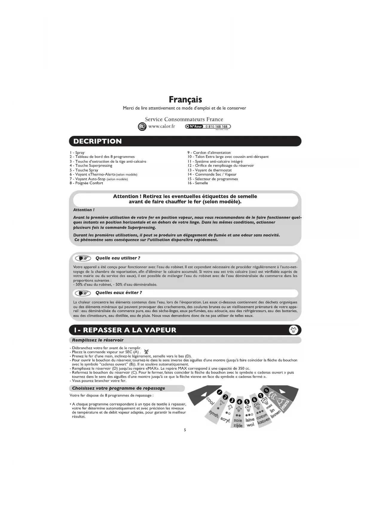 4Français Merci de lire attentivement ce mode d’emploi et de le conserver Quelle eau utiliser ? Votre appareil a été conçu pour fonctionner avec l’eau du robinet. Il est cependant nécessaire de procéder régulièrement à l’auto-net- toyage de la chambre de vaporisation, afin d’éliminer le calcaire accumulé. Si votre eau est très calcaire (ceci est vérifiable auprès de votre mairie ou du service des eaux), il est possible de mélanger l’eau du robinet avec de l’eau déminéralisée du commerce dans les proportions suivantes : - 50% d’eau du robinet, - 50% d’eau déminéralisée. Quelles eaux éviter ? La chaleur concentre les éléments contenus dans l’eau, lors de l’évaporation. Les eaux ci-dessous contiennent des déchets organiques ou des éléments minéraux qui peuvent provoquer des crachements, des coulures brunes ou un vieillissement prématuré de votre appa- reil : eau déminéralisée du commerce pure, eau des sèche-linges, eaux parfumées, eau adoucie, eau des réfrigérateurs, eau des batteries, eau des climatiseurs, eau distillée, eau de pluie. Nous vous demandons donc de ne pas utiliser de telles eaux. Attention ! Avant la première utilisation de votre fer en position vapeur, nous vous recommandons de le faire fonctionner quel- ques instants en position horizontale et en dehors de votre linge. Dans les mêmes conditions, actionner plusieurs fois la commande Superpressing. Durant les premières utilisations, il peut se produire un dégagement de fumée et une odeur sans nocivité. Ce phénomène sans conséquence sur l’utilisation disparaîtra rapidement. Attention ! Retirez les eventuelles étiquettes de semelle avant de faire chauffer le fer (selon modèle).