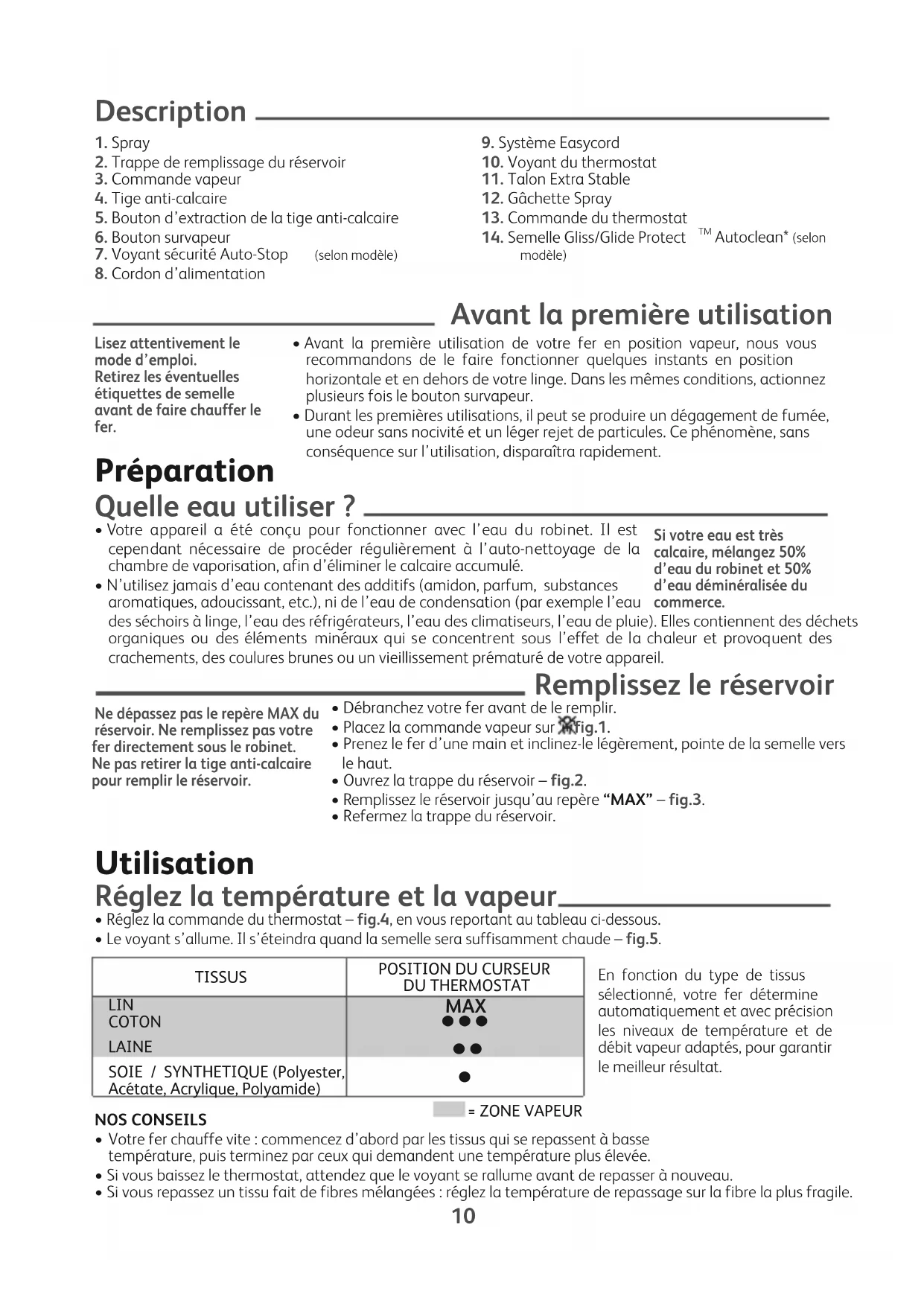- Si vous repassez un tissu fait de fibres mélangées : réglez la température de repassage sur la fibre la plus fragile. Lisez attentivement le mode d’emploi. Retirez les éventuelles étiquettes de semelle avant de faire chauffer le fer. Ne dépassez pas le repère MAX du réservoir. Ne remplissez pas votre fer directement sous le robinet. Ne pas retirer la tige anti-calcaire pour remplir le réservoir. Si votre eau est très calcaire, mélangez 50% d’eau du robinet et 50% d’eau déminéralisée du commerce. = ZONE VAPEUR TISSUS