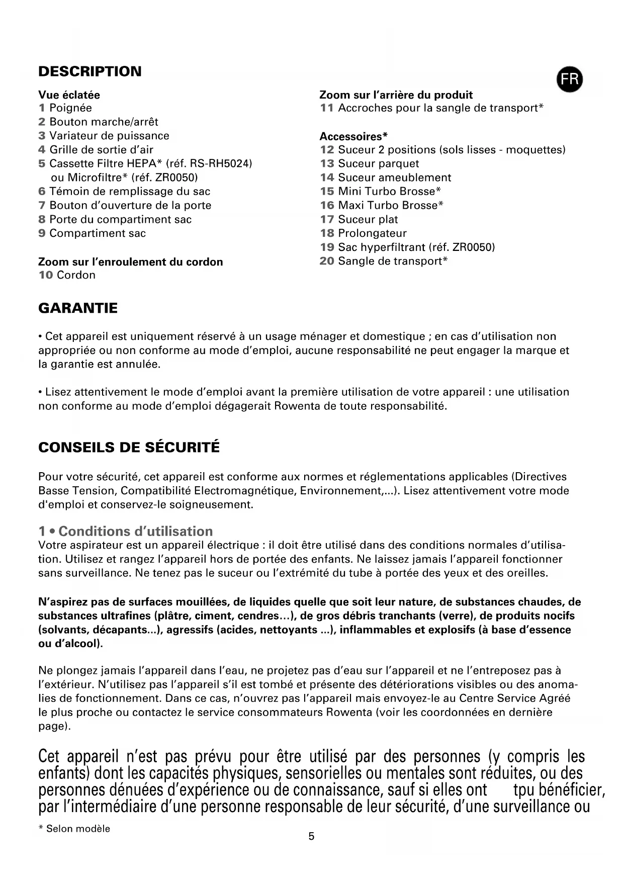 Vue éclatée 1 Poignée 2 Bouton marche/arrêt 3 Variateur de puissance 4 Grille de sortie d’air 5 Cassette Filtre HEPA* (réf. RS-RH5024) ou Microfiltre* (réf. ZR0050) 6 Témoin de remplissage du sac 7 Bouton d’ouverture de la porte 8 Porte du compartiment sac 9 Compartiment sac Zoom sur l’enroulement du cordon 10 Cordon Zoom sur l’arrière du produit 11 Accroches pour la sangle de transport* Accessoires* 12 Suceur 2 positions (sols lisses - moquettes) 13 Suceur parquet 14 Suceur ameublement 15 Mini Turbo Brosse* 16 Maxi Turbo Brosse* 17 Suceur plat 18 Prolongateur 19 Sac hyperfiltrant (réf. ZR0050) 20 Sangle de transport*