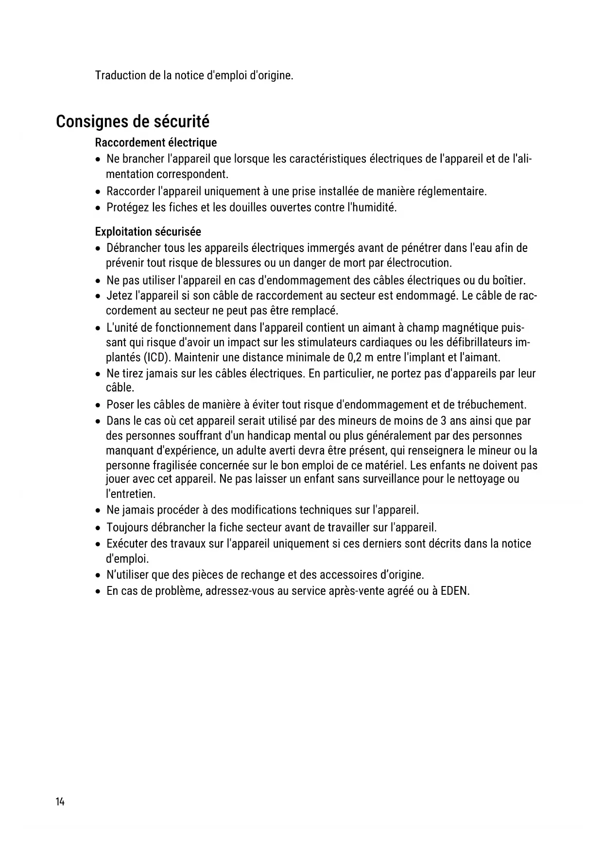 - En cas de problème, adressez-vous au service après-vente agréé ou à EDEN.DE