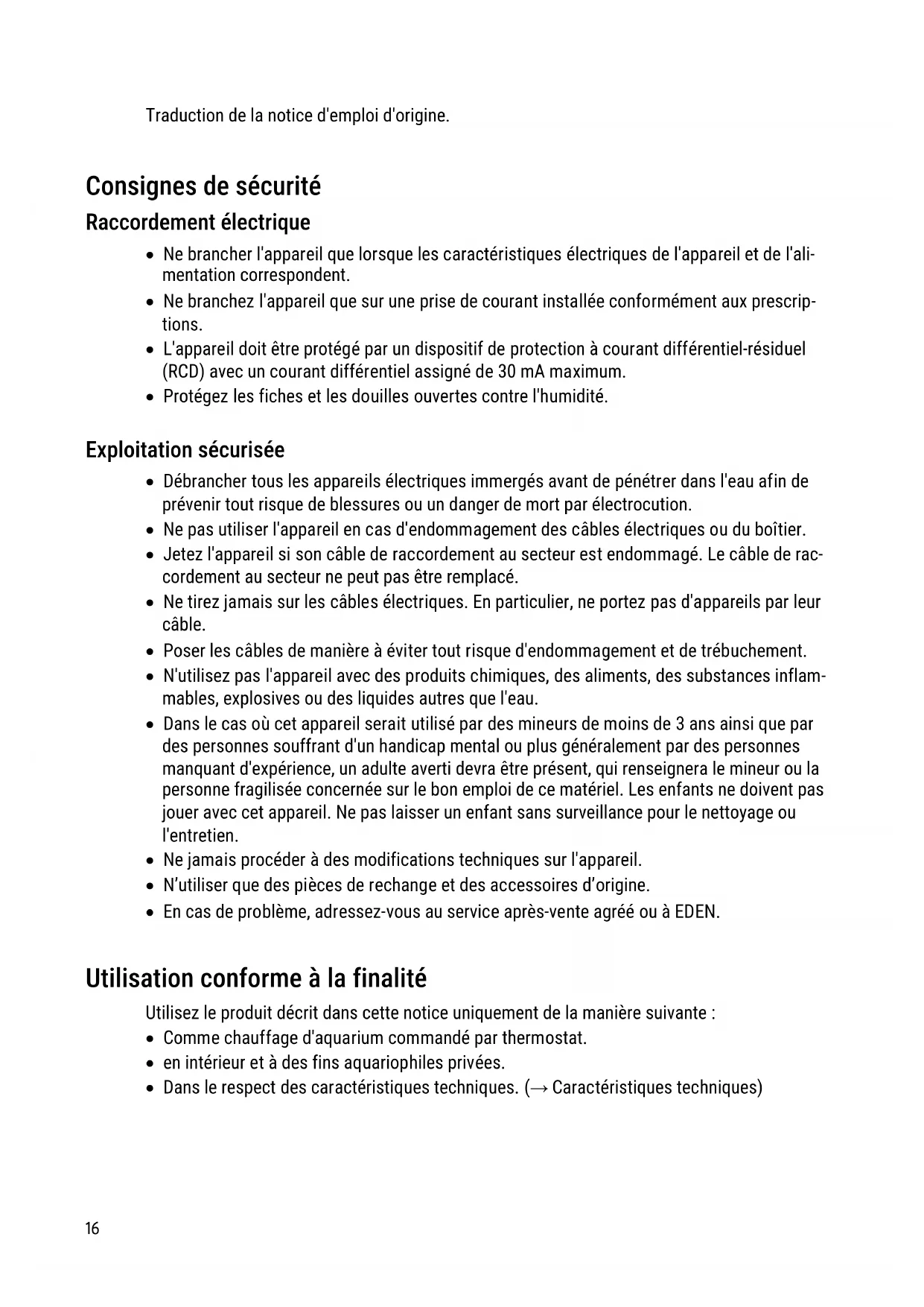 - En cas de problème, adressez-vous au service après-vente agréé ou à EDEN. Utilisation conforme à la finalité Utilisez le produit décrit dans cette notice uniquement de la manière suivante :