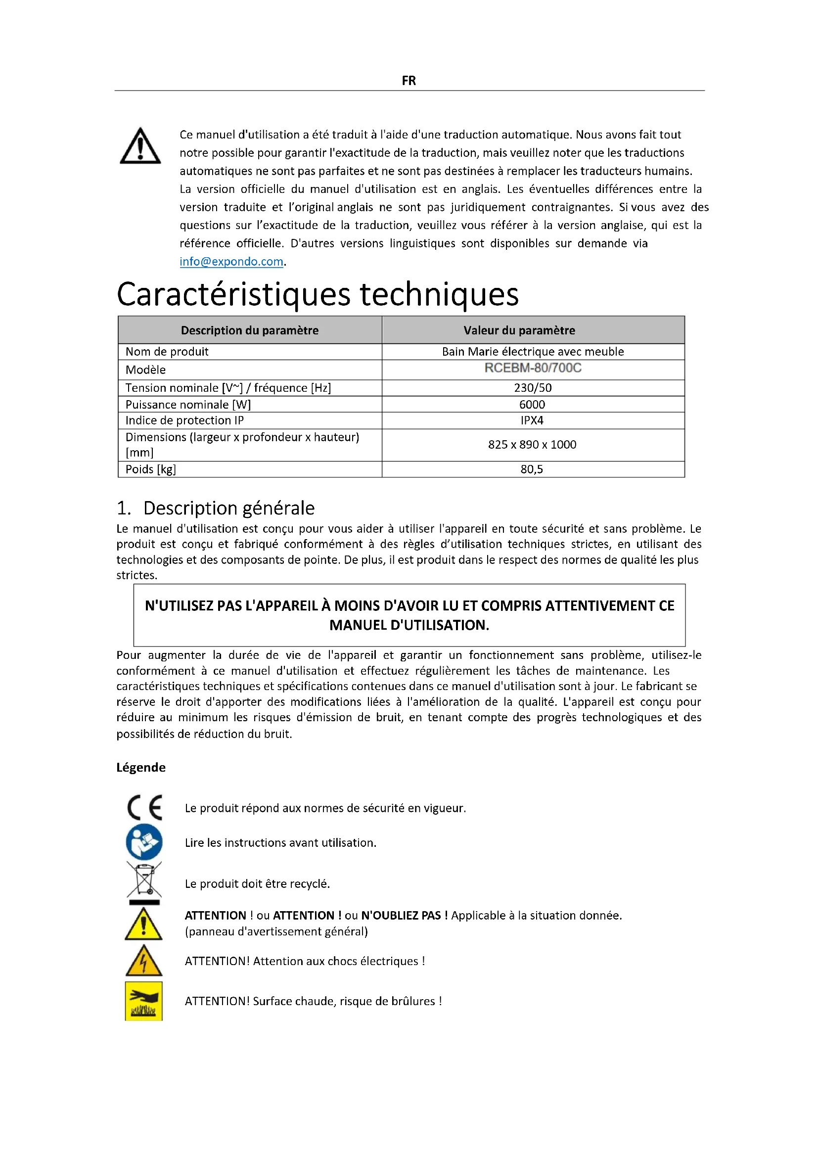 Ce manuel d'utilisation a été traduit à l'aide d'une traduction automatique. Nous avons fait tout notre possible pour garantir l'exactitude de la traduction, mais veuillez noter que les traductions automatiques ne sont pas parfaites et ne sont pas destinées à remplacer les traducteurs humains. La version officielle du manuel d'utilisation est en anglais. Les éventuelles différences entre la version traduite et l’original anglais ne sont pas juridiquement contraignantes. Si vous avez des questions sur l’exactitude de la traduction, veuillez vous référer à la version anglaise, qui est la référence officielle. D'autres versions linguistiques sont disponibles sur demande via info@expondo.com. Caractéristiques techniques Description du paramètre Valeur du paramètre Nom de produit Bain Marie électrique avec meuble Modèle