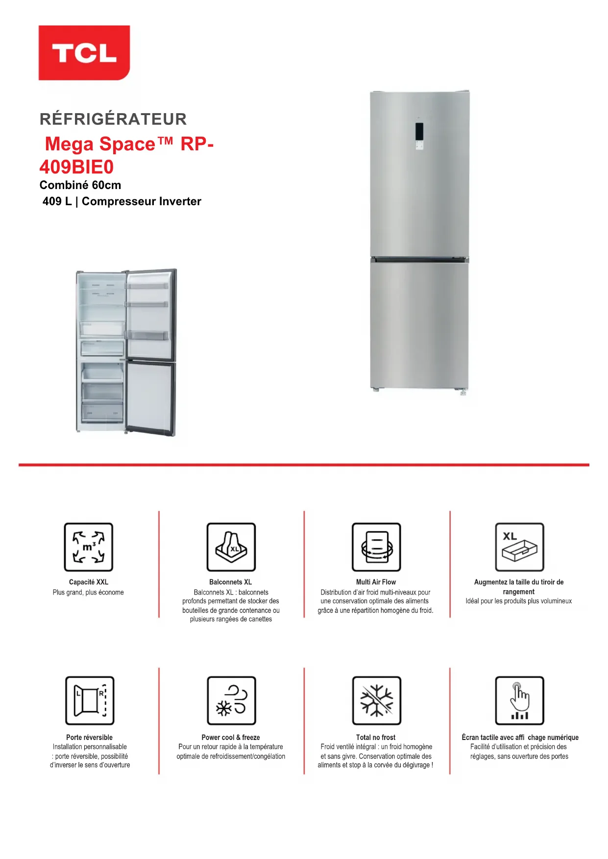 Mega Space™ RP- 409BIE0 Combiné 60cm 409 L | Compresseur Inverter Capacité XXL Plus grand, plus économe Balconnets XL Balconnets XL : balconnets profonds permettant de stocker des bouteilles de grande contenance ou plusieurs rangées de canettes Multi Air Flow Distribution d’air froid multi-niveaux pour une conservation optimale des aliments grâce à une répartition homogène du froid. Augmentez la taille du tiroir de rangement Idéal pour les produits plus volumineux Porte réversible Installation personnalisable : porte réversible, possibilité d’inverser le sens d’ouverture Power cool & freeze Pour un retour rapide à la température optimale de refroidissement/congélation Total no frost Froid ventilé intégral : un froid homogène et sans givre. Conservation optimale des aliments et stop à la corvée du dégivrage ! Écran tactile avec affi chage numérique Facilité d’utilisation et précision des réglages, sans ouverture des portesCARACTERISTIQUES GÉNÉRALES PERFORMANCE DESCRIPTION SÉCURITÉ Capacité nette totale de stockage
