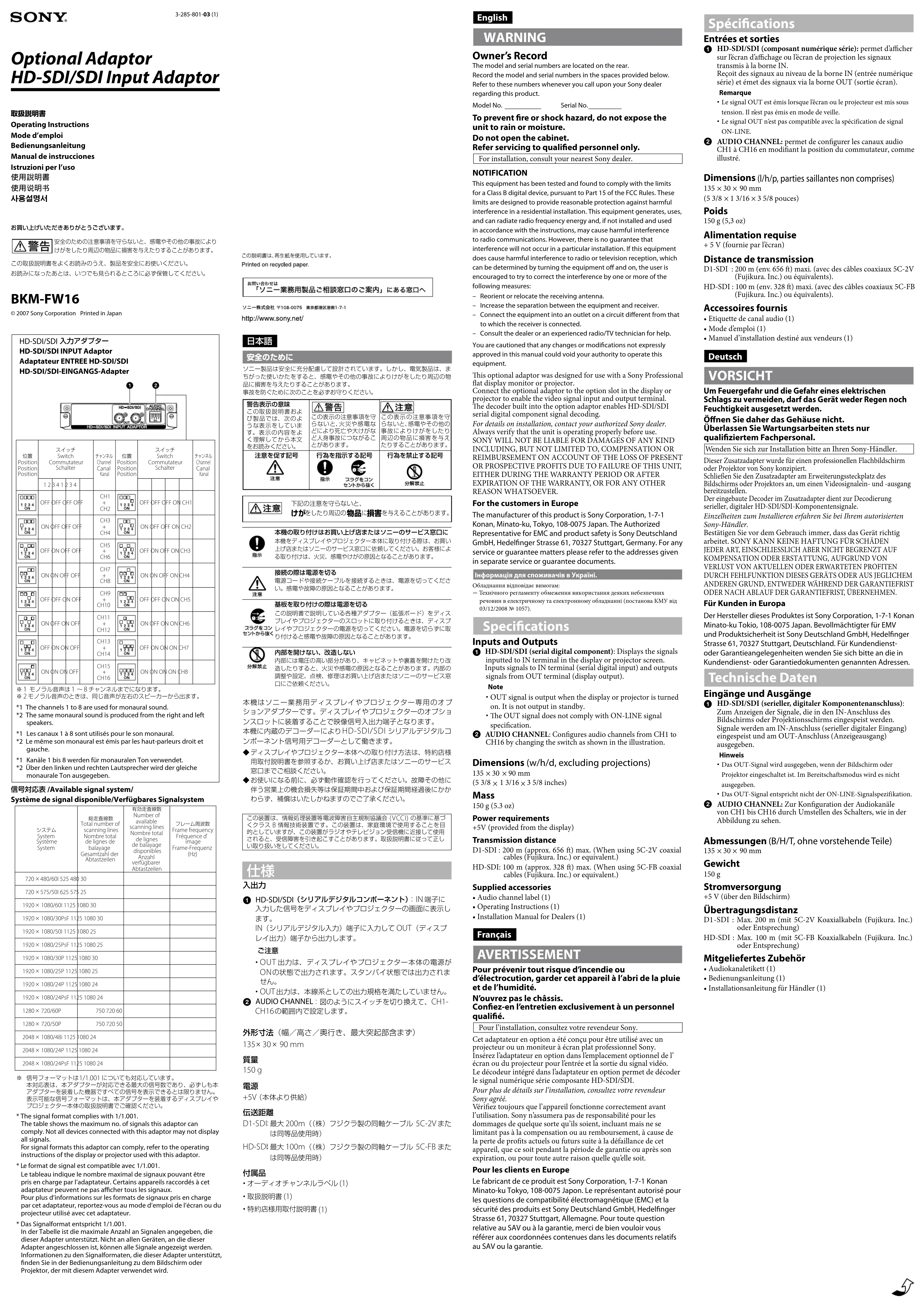 - Audio channel label (1)• Operating Instructions (1)• Installation Manual for Dealers (1) Français AVERTISSEMENT Pour prévenir tout risque d’incendie ou d’électrocution, garder cet appareil à l’abri de la pluie et de l’humidité. N’ouvrez pas le châssis. Conez-en l’entretien exclusivement à un personnel qualié. Pour l’installation, consultez votre revendeur Sony.Cet adaptateur en option a été conçu pour être utilisé avec un projecteur ou un moniteur à écran plat professionnel Sony.Insérez l’adaptateur en option dans l’emplacement optionnel de l’écran ou du projecteur pour l’entrée et la sortie du signal vidéo.Le décodeur intégré dans l’adaptateur en option permet de décoder le signal numérique série composante HD-SDI/SDI.Pour plus de détails sur l’installation, consultez votre revendeurSony agréé.Vériez toujours que l’appareil fonctionne correctement avant l’utilisation. Sony n’assumera pas de responsabilité pour les dommages de quelque sorte qu’ils soient, incluant mais ne se limitant pas à la compensation ou au remboursement, à cause de la perte de prots actuels ou futurs suite à la défaillance de cet appareil, que ce soit pendant la période de garantie ou après son expiration, ou pour toute autre raison quelle qu’elle soit. Pour les clients en Europe Le fabricant de ce produit est Sony Corporation, 1-7-1 Konan Minato-ku Tokyo, 108-0075 Japon. Le représentant autorisé pour les questions de compatibilité électromagnétique (EMC) et la sécurité des produits est Sony Deutschland GmbH, Hedelnger Strasse 61, 70327 Stuttgart, Allemagne. Pour toute question relative au SAV ou à la garantie, merci de bien vouloir vous référer aux coordonnées contenues dans les documents relatifs au SAV ou la garantie.HD-SDI/SDI入力アダプターHD-SDI/SDI INPUT AdaptorAdaptateur ENTREE HD-SDI/SDIHD-SDI/SDI-EINGANGS-Adapterお買い上げいただきありがとうございます。この取扱説明書をよくお読みのうえ、製品を安全にお使いください。お読みになったあとは、いつでも見られるところに必ず保管してください。安全のための注意事項を守らないと、感電やその他の事故によりけがをしたり周辺の物品に損害を与えたりすることがあります。
