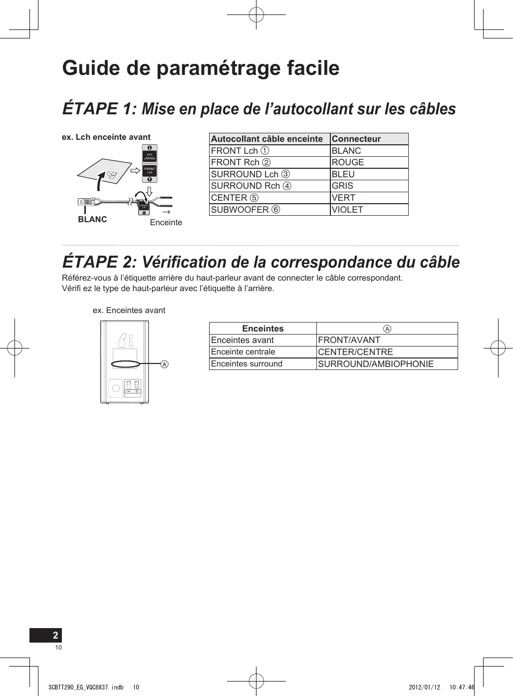 Guide de paramétrage facile Système Cinéma Maison Blu-ray Disc™ FRANÇAIS Guide de paramétrage facile ÉTAPE 1: Mise en place de l’autocollant sur les câbles ex. Lch enceinte avant FRONT Lch