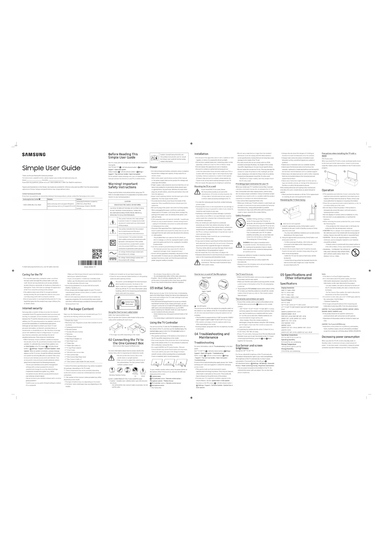 - The eco sensor is located at the bottom of the TV. Do not block the sensor with any object. This can decrease picture brightness. 05 Specifications and Other Information Specifications Display Resolution QN9**F: 7680 x 4320F6***F: 1920 x 1080H5***F: 1366 x 768Other models: 3840 x 2160 Sound (Output) H5***F: 10 WF6***F (32"): 10 W, F6***F (40"): 20 WU7***F/U8***F/QEF1/QN1EF/Q6F/Q7F/Q8F/QN7*F/S85F: 20 W QN80FA/QN80FF(100"): 30 WQN80FD/QN85F: 40 WS90F (42"): 20 W, S90F (48"-83"): 40 WQN90F (43"): 20 W, QN90F (50"): 40 WQN9*F (55"-115"): 60 WS95F/QN900F: 70 WQN950F: 80 WQN990F (65"-85"): 90 W, QN990F (98"): 120 WLS03FW: 40 WLS03FA (43"-50"): 20 W, LS03FA (55"-65"): 40 W Operating Temperature 50 °F to 104 °F (10 °C to 40 °C) Operating Humidity 10 % to 80 %, non-condensing Storage Temperature -4 °F to 113 °F (-20 °C to 45 °C) Storage Humidity 5 % to 95 %, non-condensing ENG Notes • This device is a Class B digital apparatus. • For information about the power supply, and more information about power consumption, refer to the information on the label attached to the product. – On most models, the label is attached to the back of the TV. (On some models, the label is inside the cover terminal.) – On One Connect Box models, the label is attached to the bottom of the One Connect Box. • To connect a LAN cable, use a CAT 7 (*STP type) cable for the connection. (100/10 Mbps)* Shielded Twisted Pair • The images and specifications of the Unpacking and Installation Guide may differ from the actual product.[QN990F, The Frame (LS03FW), QN900F, QN950F, S90FD, QN90FD, QN92F, QN85FD only] • This product shall not be used for control of or communications with unmanned aircraft systems. • Operation of this product shall be limited to indoor use only.[QN990F, The Frame (LS03FW) only] • Operation of this product on oil platforms, automobiles, trains, maritime vessels and aircraft shall be prohibited except for on large aircraft flying above 3,048 m (10,000 ft). Decreasing power consumption When you shut the TV off, it enters Standby mode. In Standby mode, it continues to draw a small amount of power. To decrease power consumption, unplug the power cord when you don't intend to use the TV for a long time. Simple User Guide Thank you for purchasing this Samsung product.To receive more complete service, please register your product at www.samsung.comModel Serial No. If you have any questions, please call us at 1-800-SAMSUNG (1-800-726-7864) for assistance. Figures and illustrations in this Simple User Guide are provided for reference only and may differ from the actual product appearance. Product design and specifications may change without notice.Contact Samsung world wideIf you have any questions or comments relating to Samsung products, please contact the Samsung service center.Samsung Service Center Website Address1-800-SAMSUNG (726-7864)www.samsung.com/ca/support (English)www.samsung.com/ca_fr/support (French)Samsung Electronics Canada Inc.2050 Derry Road WestMississauga, Ontario L5N 0B9Canada -00© 2025 Samsung Electronics Co., Tous droits réservés. Avant de lire ce Guide d'utilisation simple Ce téléviseur comprend ce Guide d'utilisation simple et un guide de l'utilisateur intégré.(F6***F/H5***F: > touche directionnelle vers la gauche > Paramètres > Support tech. > Ouvrir le guide de l’utilisateur) > touche directionnelle vers la gauche > Paramètres > Support tech. > Conseils et guides de l’utilisateur > Ouvrir le guide de l’utilisateur) Sur le site Web (www.samsung.com), vous pouvez télécharger le guide d'utilisation et voir son contenu sur votre ordinateur ou votre appareil mobile. Avertissement! Consignes de sécurité importantes Avant d'utiliser le téléviseur, veuillez lire les instructions de sécurité.Consultez le tableau ci-dessous pour connaître la signification des symboles qui pourraient se trouver sur votre appareil Samsung.MISE EN GARDERISQUE DE DÉCHARGE ÉLECTRIQUE. NE PAS OUVRIR.MISE EN GARDE : AFIN DE RÉDUIRE LE RISQUE DE CHOC ÉLECTRIQUE, N'ENLEVEZ PAS LE COUVERCLE (OU LE PANNEAU ARRIÈRE). AUCUNE PIÈCE POUVANT ÊTRE RÉPARÉE PAR L'UTILISATEUR NE SE TROUVE À L'INTÉRIEUR. VEUILLEZ VOUS ADRESSER À UN TECHNICIEN AGRÉÉ POUR TOUTE RÉPARATION.Ce symbole indique la présence d'une haute tension à l'intérieur. Tout contact avec une pièce interne de l'appareil présente un danger.Ce symbole vous informe qu'une documentation importante relative au fonctionnement et à l'entretien est fournie avec le produit.qu'une connexion de sécurité de mise à la terre (à la masse) n'est pas requise. Si ce symbole ne se trouve pas sur un appareil doté d’un cordon d’alimentation, le produit DOIT avoir un conducteur de protection fiable (mise à la terre).par ce symbole est la tension CA.par ce symbole est la tension CC.Mise en garde. Consultez les instructions aux fins d'utilisation : Ce symbole indique à l'utilisateur qu'il doit consulter le Guide d'utilisation simple pour avoir de l'information au sujet de la sécurité. Mise sous tension