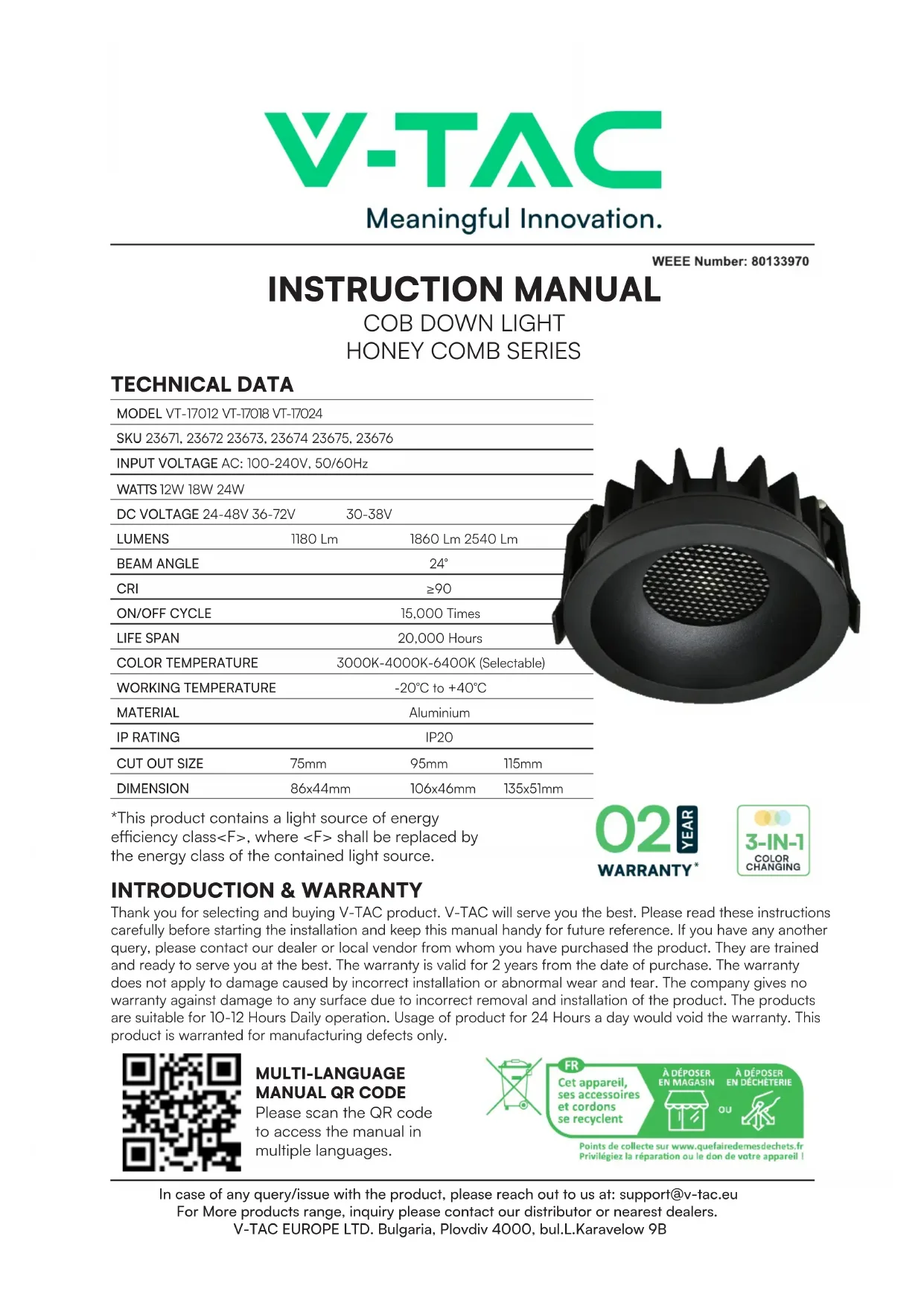 Merci d'avoir choisi et acheté un produit V-TAC. V-TAC vous servira au mieux. Veuillez lire attentivement ces instructions avant de commencer l'installation et conservez ce manuel à portée de main pour pouvoir vous y référer ultérieurement. Si vous avez d'autres questions, veuillez contacter notre revendeur ou le vendeur local auprès duquel vous avez acheté le produit. Ils sont formés et prêts à vous servir au mieux. La garantie est valable pendant 2 ans à compter de la date d'achat. La garantie ne s'applique pas aux dommages causés par une installation incorrecte ou une usure anormale. L'entreprise ne garantit pas les dommages causés à toute surface par un démontage et une installation incorrects du produit. Les produits conviennent pour un fonctionnement quotidien de 10 à 12 heures. L'utilisation du produit pendant 24 heures par jour annule la garantie. Ce produit est garanti pour les défauts de fabrication uniquement.