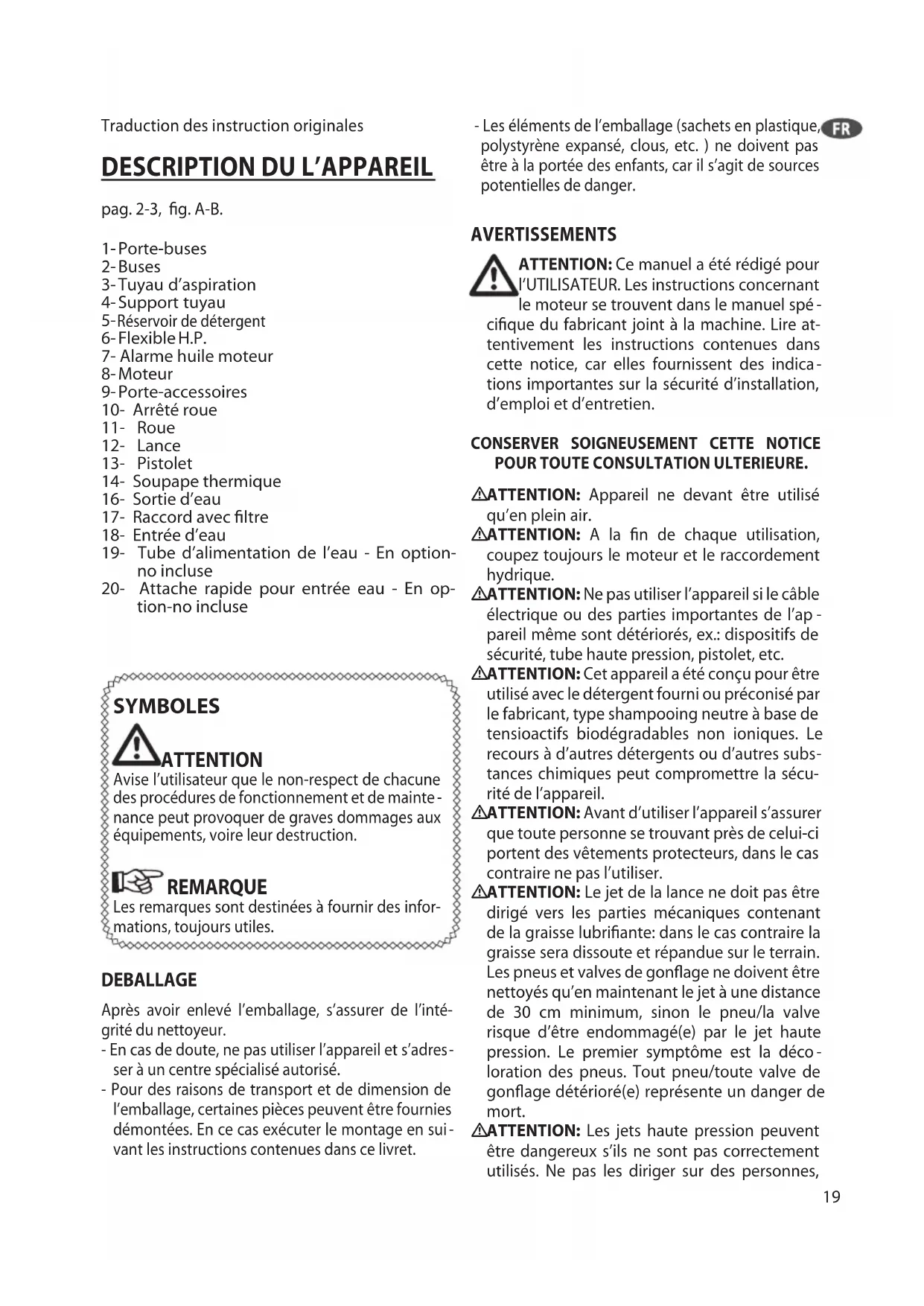 ATTENTION: Appareils n’étant pas dotés de S.A.A. – Système d’Arrêt Automatique: ils ne doivent pas continuer de fonctionner plus de 2 minutes après que le pistolet a été relâché. L’eau recyclée augmente énormément sa tem