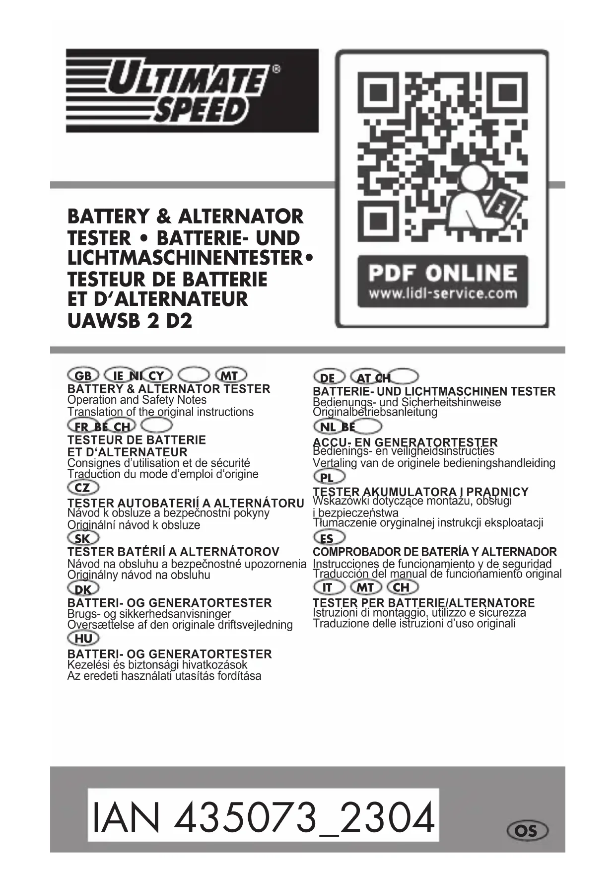 jusqu’à trois appareils usagés – dont aucun côté ne doit dépasser 25cm, indépendamment de l’achat d’un appareil neuf. Avant tout dépôt, veuillez supprimer toutes les données personnelles. Avant le dépôt, sortez les batteries ou les accumulateurs qui ne sont pas intégrés à l’appareil usagé ainsi que les ampoules que vous pouvez retirer sans les endommager et déposez-les dans un centre de collecte adapté. Les batteries contenant des produits nocifs sont caractérisées par les symboles ci-contre interdisant de les jeter avec les ordures ména- gères. Les désignations du métal lourd en question sont: Cd = cadmium, Hg = mercure, Pb = plomb. Déposez les batteries usagées dans un point de collecte de votre ville ou de votre municipalité ou rapportez-les chez votre commerçant. Vous vous conformez ainsi aux obligations légales et contribuez de manière essentielle à la protection de l’environnement. Respectez le marquage sur les différents emballages et triez-les si nécessaire. Les emballages sont identifiés par des abrévia- tions(a) et des chiffres(b) ayant la signification suivante: 1 – 7: plastiques, 20 – 22: papier et carton, 80 – 98: composites. z Déclaration de conformité UE Nous, la société50 FR/BE/CH C. M. C. GmbH Holding Responsable des documents : Dr. Christian Weyler Katharina-Loth-Str. 15 DE-66386 St. Ingbert Allemagne déclarons sous notre responsabilité exclusive que le produit Testeur de batterie et d'alternateur IAN: 435073_2304 Année de fabrication: 52/2023 Réf: 2615 Modèle: UAWSB2D2 satisfait aux exigences de protection essentielles indi- quées dans les directives européennes Directive UE compatibilité électromagnétique 2014/30/EU Directive RoHS 2011/65/EU+2015/863/EU et leurs modifications. La présente déclaration de conformité est établie sous la seule responsabilité du fabricant. L’objet de la déclaration décrit ci-dessus satisfait aux pres- criptions de la directive 2011 / 65 / EU du Parlement et du Conseil Européen datées du 8 juin 2011 et relatives àFR/BE/CH