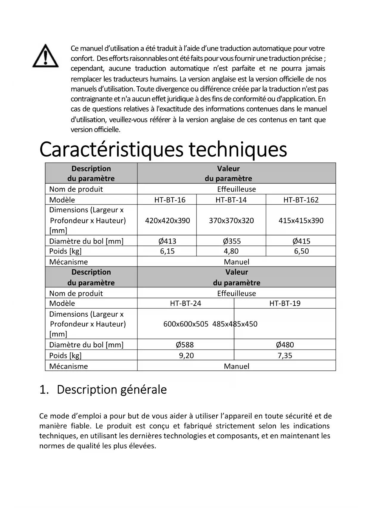 j) N'utilisez pas d'objets pointus et/ou métalliques (par exemple une brosse métallique ou une spatule métallique) car ils pourraient endommager la surface du matériau de l'appareil. k) Ne nettoyez pas l'appareil avec des substances acides, des produits médicaux, des diluants, du carburant, de l'huile ou d'autres produits chimiques car cela pourrait endommager l'appareil.Dati tecnici Descrizione del parametro Valore del parametro Nome del prodotto Trimmer Modello HT-BT-16 HT-BT-14 HT-BT-162 Dimensioni (Larghezza - Profondità- Altezza) [mm] 420x420x390 370x370x320 415x415x390 Diametro vasca [mm] Ø413 Ø355 Ø415 Peso [kg] 6,15 4,80 6,50 Meccanismo Manuale Descrizione del parametro Valore del parametro Nome del prodotto Trimmer Modello HT-BT-24 HT-BT-19 Dimensioni (Larghezza - Profondità- Altezza) [mm] 600x600x505 485x485x450 Diametro vasca [mm] Ø588 Ø480 Peso [kg] 9,20 7,35 Meccanismo Manuale