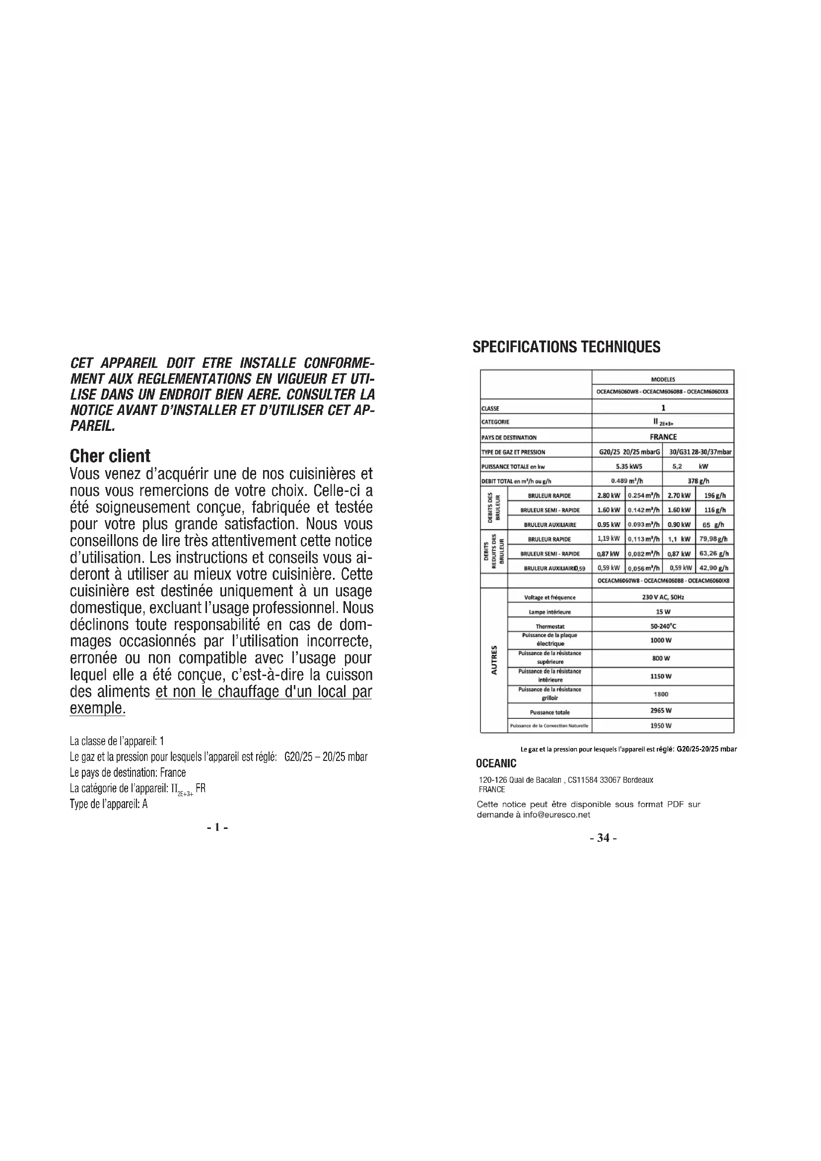 Le gaz et la pression pour lesquels l'appareil est réglé: G20/25-20/25 mbarOCEANIC120-126 Quai de Bacalan , CS11584 33067 BordeauxFRANCECette notice peut être disponible sous format PDF sur demande à info@euresco.net- 33 -