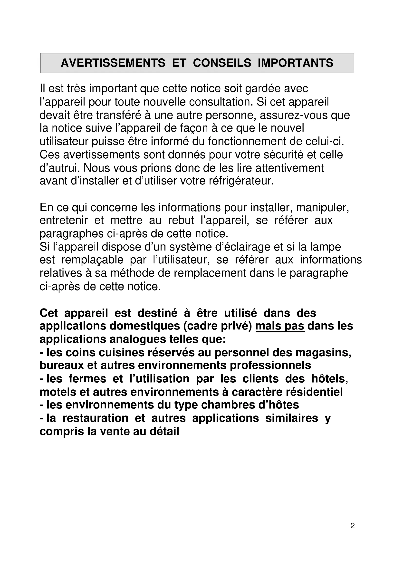 Il est très important que cette notice soit gardée avec l’appareil pour toute nouvelle consultation. Si cet appareil devait être transféré à une autre personne, assurez-vous que la notice suive l’appareil de façon à ce que le nouvel utilisateur puisse être informé du fonctionnement de celui-ci. Ces avertissements sont donnés pour votre sécurité et celle d’autrui. Nous vous prions donc de les lire attentivement avant d’installer et d’utiliser votre réfrigérateur. En ce qui concerne les informations pour installer, manipuler, entretenir et mettre au rebut l’appareil, se référer aux paragraphes ci-après de cette notice. Si l’appareil dispose d’un système d’éclairage et si la lampe est remplaçable par l’utilisateur, se référer aux informations relatives à sa méthode de remplacement dans le paragraphe ci-après de cette notice. Cet appareil est destiné à être utilisé dans des applications domestiques (cadre privé) mais pas dans les applications analogues telles que: - les coins cuisines réservés au personnel des magasins, bureaux et autres environnements professionnels - les fermes et l’utilisation par les clients des hôtels, motels et autres environnements à caractère résidentiel - les environnements du type chambres d’hôtes - la restauration et autres applications similaires y compris la vente au détail3 Sécurité Cet appareil peut être utilisé par des enfants âgés d'au moins 8 ans et par des personnes ayant des capacités physiques, sensorielles ou mentales réduites ou dénuées d’expérience ou de connaissance, s'ils (si elles) sont correctement surveillé(e)s ou si des instructions relatives à l'utilisation de l'appareil en toute sécurité leur ont été données et si les risques encourus ont été appréhendés. Les enfants ne doivent pas jouer avec l’appareil. Il convient de maintenir à distance les enfants de moins de 3 ans, à moins qu'ils ne soient sous une surveillance continue. Le nettoyage et l'entretien par l'usager ne doivent pas être effectués par des enfants sans surveillance. Les enfants âgés de 3 à 8 ans sont autorisés à charger et décharger les appareils de réfrigération. Débranchez toujours la prise de courant avant de procéder à son nettoyage ; de procéder à son dégivrage ; de changer la lampe d’éclairage ; de déplacer l‘appareil ou de nettoyer le sol sous l’appareil. MISE EN GARDE : Ne pas endommager le circuit de réfrigération. MISE EN GARDE : Ne pas utiliser d'appareils électriques à l'intérieur du compartiment de stockage des denrées, à moins qu'ils ne soient du type recommandé par le fabricant. MISE EN GARDE : Ne pas utiliser de dispositifs mécanique ou autre moyens pour accélérer le processus de dégivrage autres que ceux recommandés par le fabricant. MISE EN GARDE : Maintenir dégagées les ouvertures de ventilation dans l'enceinte de l'appareil ou dans la structure d'encastrement. Ne pas brancher l’appareil à une prise de courant non protégée contre les surcharges (fusible). Ne jamais utiliser de prises multiples ou de rallonge pour brancher l’appareil.4 MISE EN GARDE : Ne pas placer de blocs multiprises ni de blocs d’alimentation portable à l’arrière de l’appareil Cet appareil n’est pas destiné à être mis en fonctionnement au moyen d'une minuterie extérieure ou par un système de commande à distance séparé ou tout autre dispositif qui met l’appareil sous tension automatiquement. Ne pas stocker dans cet appareil des substances explosives telles que des aérosols contenant des gaz propulseurs inflammables. MISE EN GARDE : lors de l’installation, s’assurer que le cordon d’alimentation n’est pas coincé ni endommagé. Après installation, vérifiez qu’il ne repose pas sur le câble d’alimentation. Si le câble d’alimentation est endommagé, il doit être remplacé par le fabricant, son service après-vente ou des personnes de qualifications similaires afin d’éviter un danger. Cet appareil est lourd ; faites attention lors d’un déplacement. Si votre appareil a été couché pendant le transport, attendre 48h avant de le mettre en fonctionnement. S’il en pourvu, l’ampoule est destinée à être exclusivement utilisée dans cet appareil. S’il en pourvu, l’ampoule ne convient pas pour l’éclairage d’une pièce d’un ménage. Il convient de respecter les consignes d’utilisation pour s’assurer de la sûreté de la conservation des denrées alimentaires. Il convient de respecter le chargement dans les compartiments indiqués dans la notice et le produit. Pour éviter la contamination des aliments, il y a lieu de respecter les instructions suivantes : – Des ouvertures de la porte de manière prolongée sont susceptibles d'entraîner une augmentation significative de température des compartiments de l'appareil.5 – Nettoyer régulièrement les surfaces susceptibles d'être contact avec les aliments et les systèmes d'évacuation accessibles. – Nettoyer les récipients d'eau s'ils n'ont pas été utilisés pendant 48h ; bien rincer le système de distribution raccordé à un réseau de distribution d'eau si de l'eau n'a pas été prélevée pendant 5 jours. – Entreposer la viande et le poisson crus dans les bacs du réfrigérateur qui conviennent, de telle sorte que ces denrées ne soient pas en contact avec d'autres aliments ou qu'elles ne s'égouttent pas sur les autres aliments. – Les compartiments « deux étoiles » pour denrées congelées conviennent pour stocker des aliments précongelés, stocker ou fabriquer de la crème glacée et des cubes de glace. – Les compartiments « une, deux et trois étoiles » ne conviennent pas pour la congélation des denrées alimentaires fraîches. – Si l’appareil de réfrigération demeure vide de manière prolongée, le mettre hors tension, en effectuer le dégivrage, le nettoyer, le sécher, et laisser la porte ouverte pour prévenir le dévelo