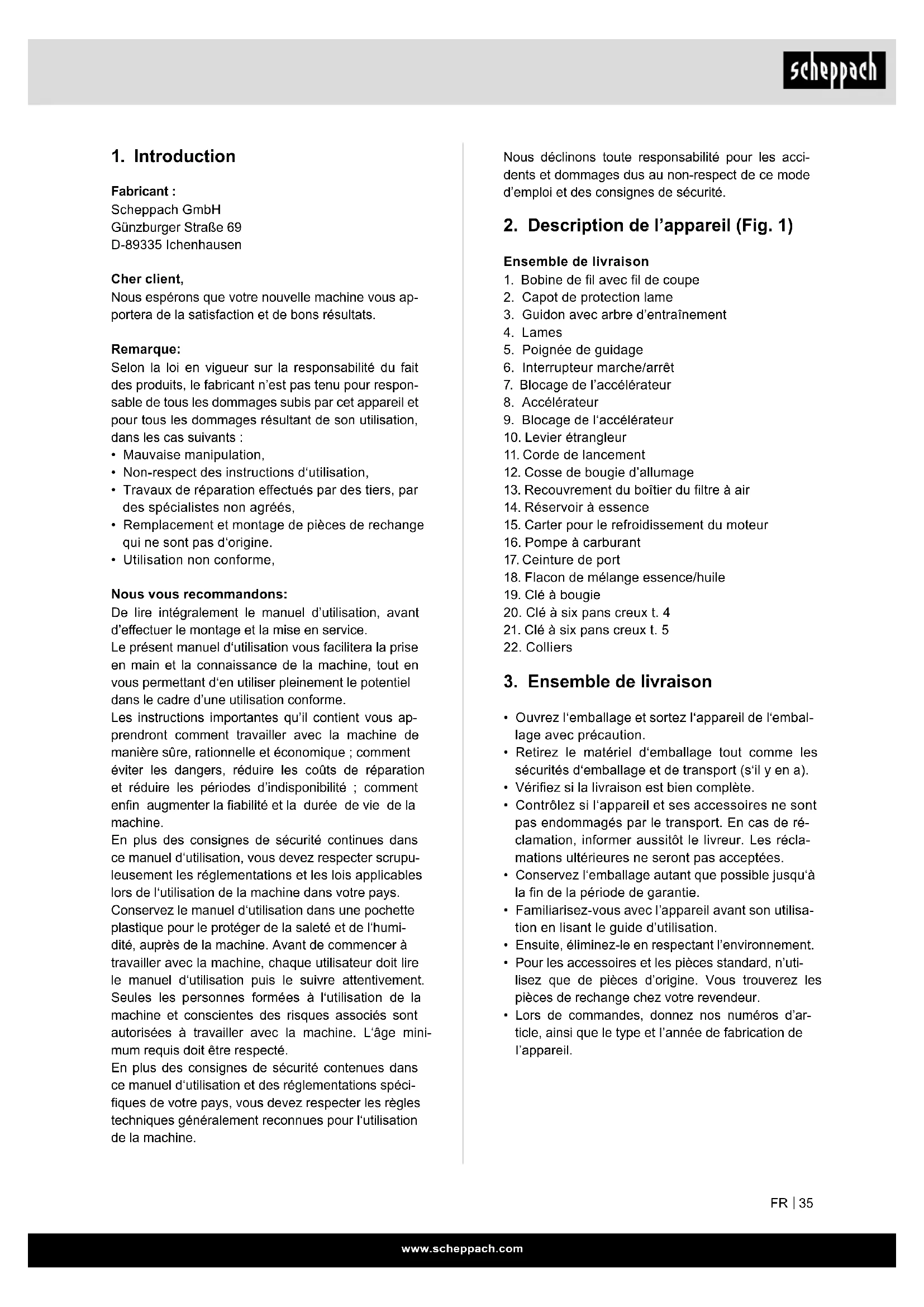 Fabricant : Scheppach GmbH Günzburger Straße 69 D-89335 Ichenhausen Cher client, Nous espérons que votre nouvelle machine vous ap- portera de la satisfaction et de bons résultats. Remarque: Selon la loi en vigueur sur la responsabilité du fait des produits, le fabricant n’est pas tenu pour respon- sable de tous les dommages subis par cet appareil et pour tous les dommages résultant de son utilisation, dans les cas suivants :