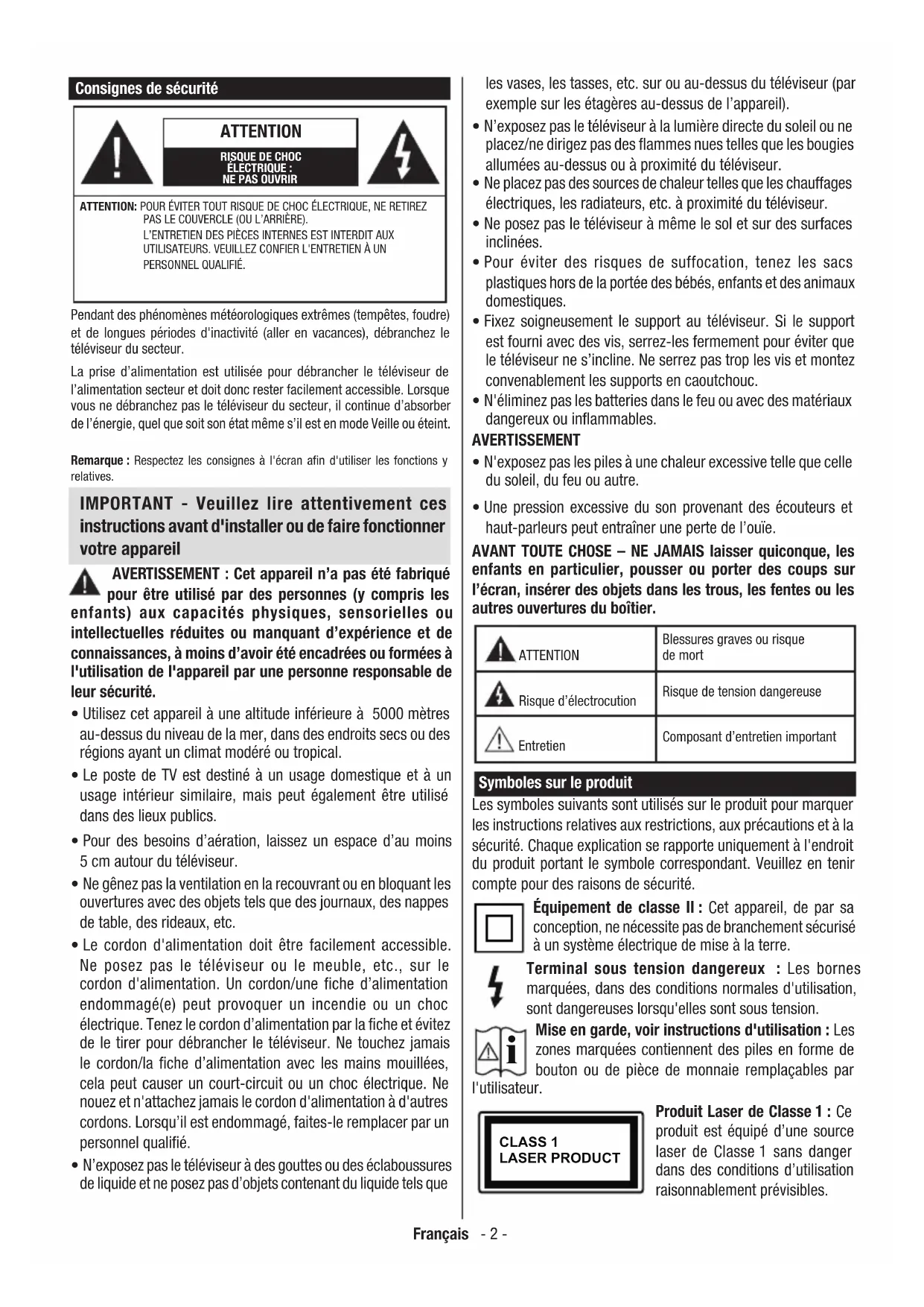 - Une pression excessive du son provenant des écouteurs et haut-parleurs peut entraîner une perte de l’ouïe. AVANT TOUTE CHOSE – NE JAMAIS laisser quiconque, les enfants en particulier, pousser ou porter des coups sur l’écran, insérer des objets dans les trous, les fentes ou les autres ouvertures du boîtier. ATTENTION Blessures graves ou risque de mort Risque d’électrocution Risque de tension dangereuse Entretien Composant d’entretien important Symboles sur le produit Les symboles suivants sont utilisés sur le produit pour marquer les instructions relatives aux restrictions, aux précautions et à la sécurité. Chaque explication se rapporte uniquement à l'endroit du produit portant le symbole correspondant. Veuillez en tenir compte pour des raisons de sécurité. Équipement de classe II: Cet appareil, de par sa conception, ne nécessite pas de branchement sécurisé à un système électrique de mise à la terre. Terminal sous tension dangereux : Les bornes marquées, dans des conditions normales d'utilisation, sont dangereuses lorsqu'elles sont sous tension.