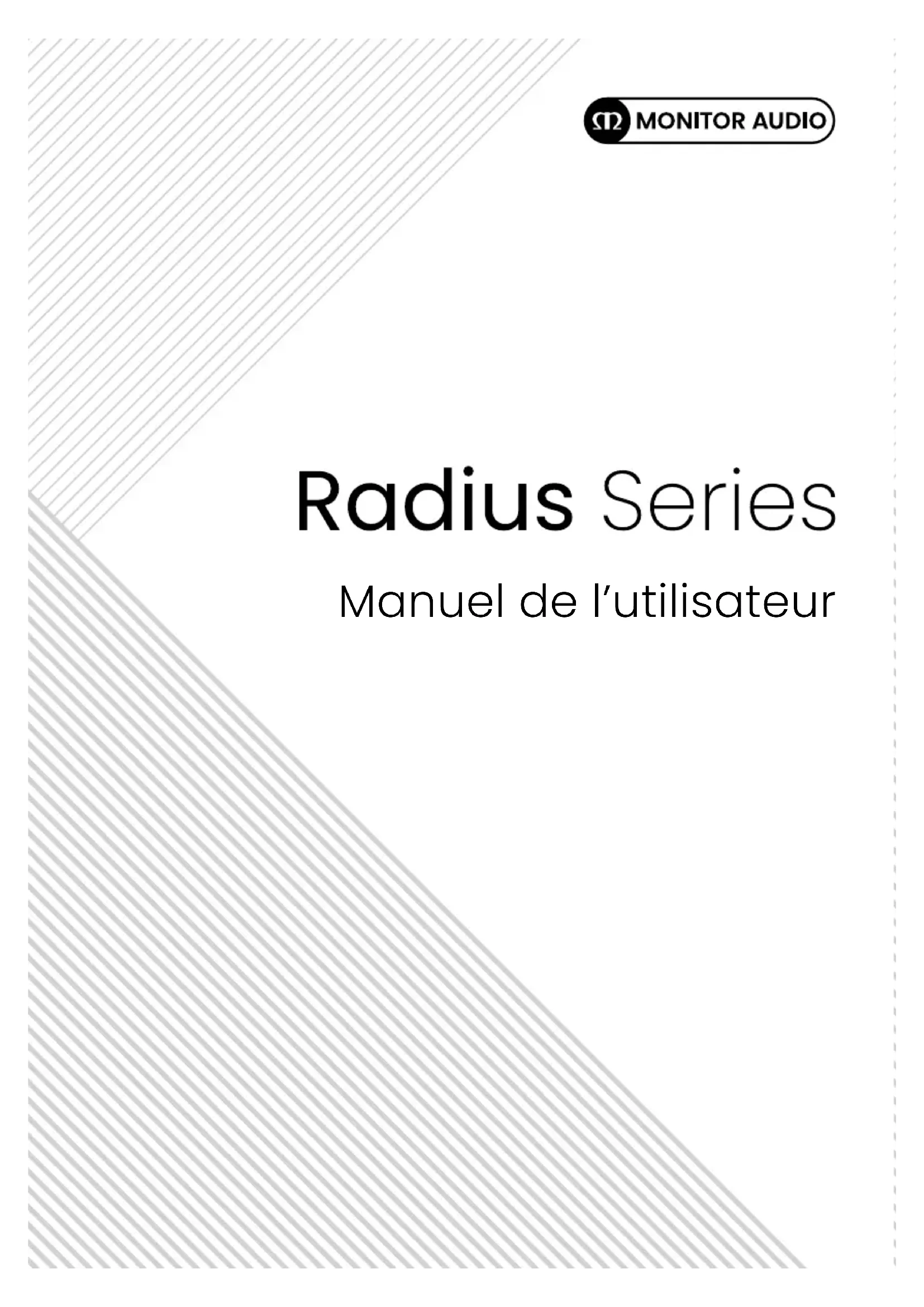 FRANCAISIntroduction Félicitations et merci de votre achat des haut-parleurs de la série Radius. Nous avons la certitude qu'ils vous offriront des années de divertissement et de plaisir car nous n'avons utilisé que des composants de haute qualité sur l'ensemble du produit. Veuillez lire ce manuel de l'utilisateur attentivement car il contient des informations importantes sur les procédures de positionnement et de configuration. Pour plus d'informations avancées, veuillez consulter notre site Web : www.monitoraudio.com Le Radius 45 incorpore un dispositif de protection thermique qui permet de protéger l'unité de lecture et le tweeter de dégâts permanents. Si les haut-parleurs cessent de fonctionner après une longue période de lecture, éteignez la source pendant environ 10 minutes puis réessayez. Installation et positionnement Même si vous avez déjà réfléchi à la position et à la pertinence du produit avant l'achat de ces haut-parleurs, cette section vous guidera pour obtenir une configuration et un positionnement optimaux (une illustration est fournie en page 4 pour vous aider pour le positionnement). Pour des instructions sur l'installation du Radius 225 ou du Radius One sur un mur, reportez-vous à la page 5. Le Radius One propose des éléments de fixation avec un support mural Sanus. REMARQUE : Le Radius 45 et le Radius 90 peuvent être fixés à un mur avec notre support de haut-parleur universel vendu séparément. Le Radius 200 n'est pas conçu pour être monté sur un mur. Des pieds en caoutchouc auto-adhésif sont fournis pour éviter les mouvements causés par les vibrations lorsque les haut-parleurs de la série Radius sont sur une table / un support d'équipement. Le Radius 270 est fourni avec des pieds en caoutchouc montés sur le socle pour une utilisation sur les sols durs. Vous trouverez plus de détails à ce sujet en page 10. Radius One Le Radius One peut être placé juste en dessous ou juste au-dessus de votre TV / l'écran de votre projecteur. Il peut être monté sur un mur avec le support fourni (voir page 5) ou avec le support de haut-parleur Sanus VMA202 Soundbar, voir www.sanus.com pour plus de détails. Radius 200 Le Radius 200 est la première enceinte centrale dédiée de la série, et est conçu pour être placé sur une étagère ou un meuble. Série Radius 12monitoraudio.com