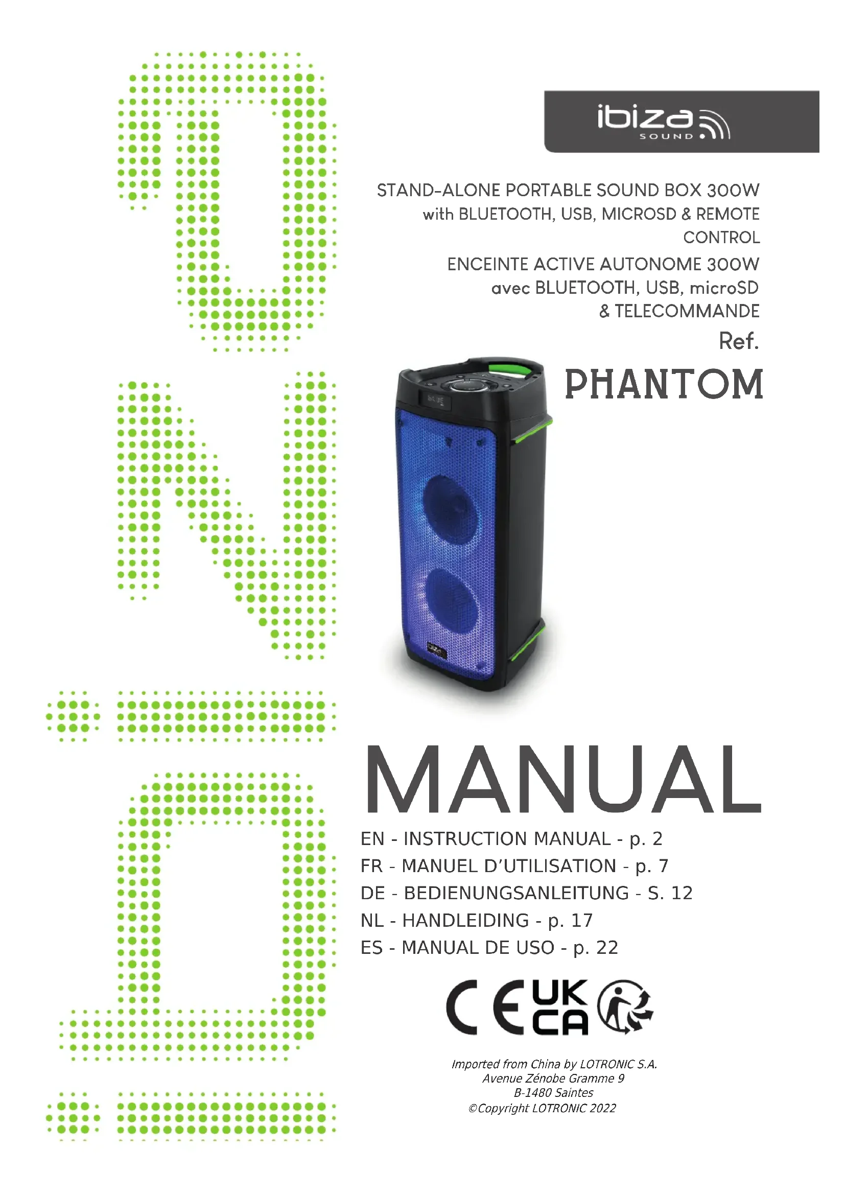 IEC 62321-8 : 2017 Place and date of issue: Saintes ( Belgium ), on 03/12/2021 Manuel De Sousa Quality ManagerDéclaration UE de Conformité Nous, LOTRONIC SA Avenue Zénobe Gramme, 9 1480 SAINTES Belgique +32.2.390.91.91 Certifions et déclarons sous notre seule responsabilité que les produits suivants : Marque: IBIZA Désignation commerciale : Système de sonorisation portable Type ou modèle : PHANTOM Auxquels se réfère cette déclaration sont conformes aux exigences essentielles et aux autres dispositions pertinentes de la directive RED 2014/53/EU, la directive ErP 2009/125/EU, le règlement (CE) 1275/2008, 801/2013/EC la directive RoHS 2011/65/EU et la directive déléguée (UE) N° 2015/863 Les produits sont en conformité avec les normes et/ou autres documents normatifs suivants : EN 62368-1 : 2014 + A11 : 2017