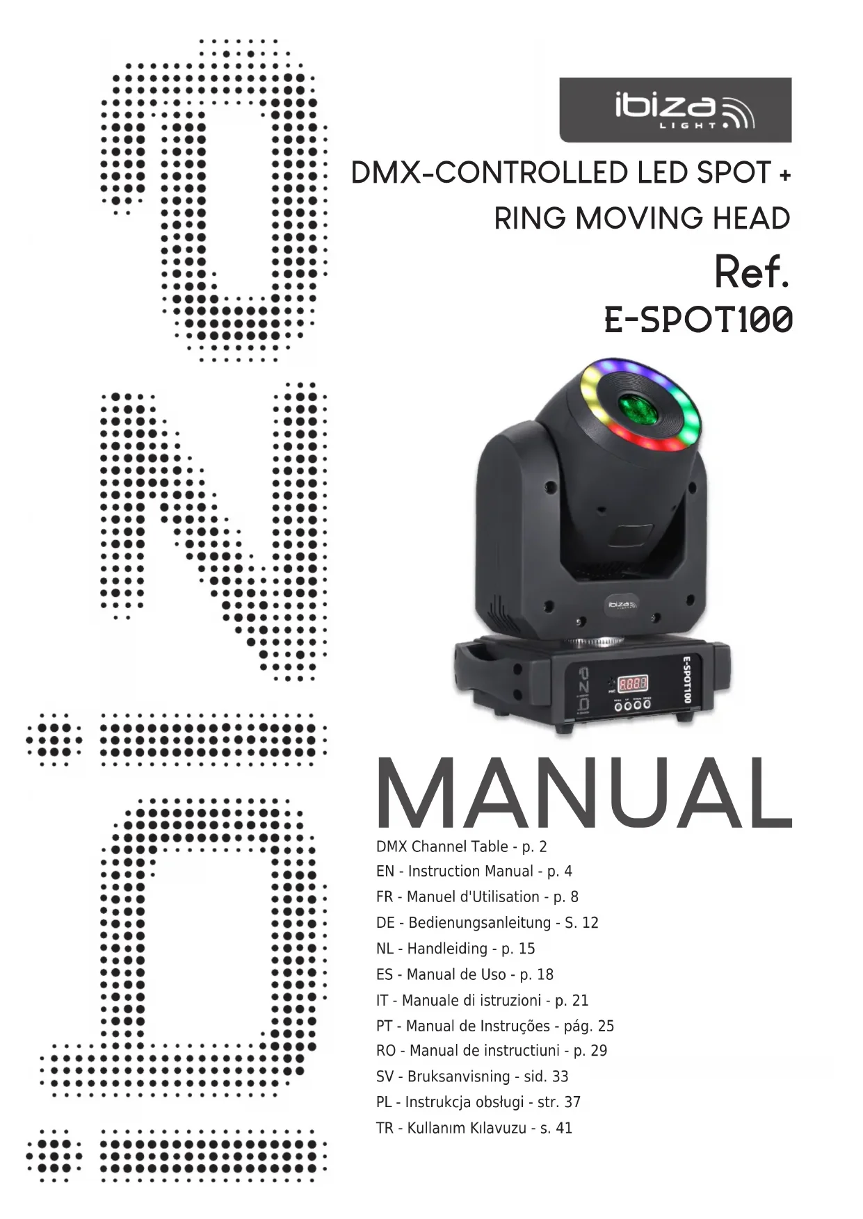 La résistance de n de ligne réduit les erreurs de signal. Pour éviter des problèmes de transmission des signaux, il est toujours conseillé de brancher une résistance de n de ligne DMX.MANUAL - E-SPOT100