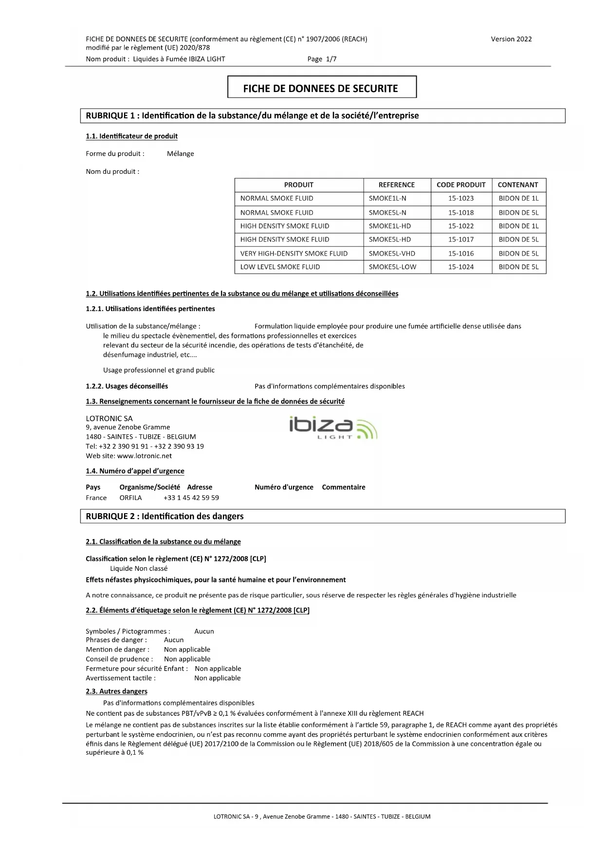 Tel: +32 2 390 91 91 - +32 2 390 93 19 Web site: www.lotronic.net 1.4. Numéro d’appel d’urgence Pays Organisme/Société Adresse Numéro d'urgence Commentaire France ORFILA +33 1 45 42 59 59 RUBRIQUE 2 : Identification des dangers 2.1. Classification de la substance ou du mélange Classification selon le règlement (CE) N° 1272/2008 [CLP] Liquide Non classé Effets néfastes physicochimiques, pour la santé humaine et pour l’environnement A notre connaissance, ce produit ne présente pas de risque particulier, sous réserve de respecter les règles générales d'hygiène industrielle 2.2. Éléments d’étiquetage selon le règlement (CE) N° 1272/2008 [CLP] Symboles / Pictogrammes : Aucun Phrases de danger : Aucun Mention de danger : Non applicable Conseil de prudence : Non applicable Fermeture pour sécurité Enfant : Non applicable Avertissement tactile : Non applicable 2.3. Autres dangers Pas d'informations complémentaires disponibles Ne contient pas de substances PBT/vPvB ≥ 0,1 % évaluées conformément à l'annexe XIII du règlement REACH Le mélange ne contient pas de substances inscrites sur la liste établie conformément à l’article 59, paragraphe 1, de REACH comme ayant des propriétés perturbant le système endocrinien, ou n’est pas reconnu comme ayant des propriétés perturbant le système endocrinien conformément aux critères éfinis dans le Règlement délégué (UE) 2017/2100 de la Commission ou le Règlement (UE) 2018/605 de la Commission à une concentration égale ou supérieure à 0,1 % FICHE DE DONNEES DE SECURITEFICHE DE DONNEES DE SECURITE (conformément au règlement (CE) n° 1907/2006 (REACH) Version 2022 modifié par le règlement (UE) 2020/878 Nom produit : Liquides à Fumée IBIZA LIGHT Page 2/7 LOTRONIC SA - 9 , Avenue Zenobe Gramme - 1480 - SAINTES - TUBIZE - BELGIUM RUBRIQUE 3 : Composition/informations sur les composants