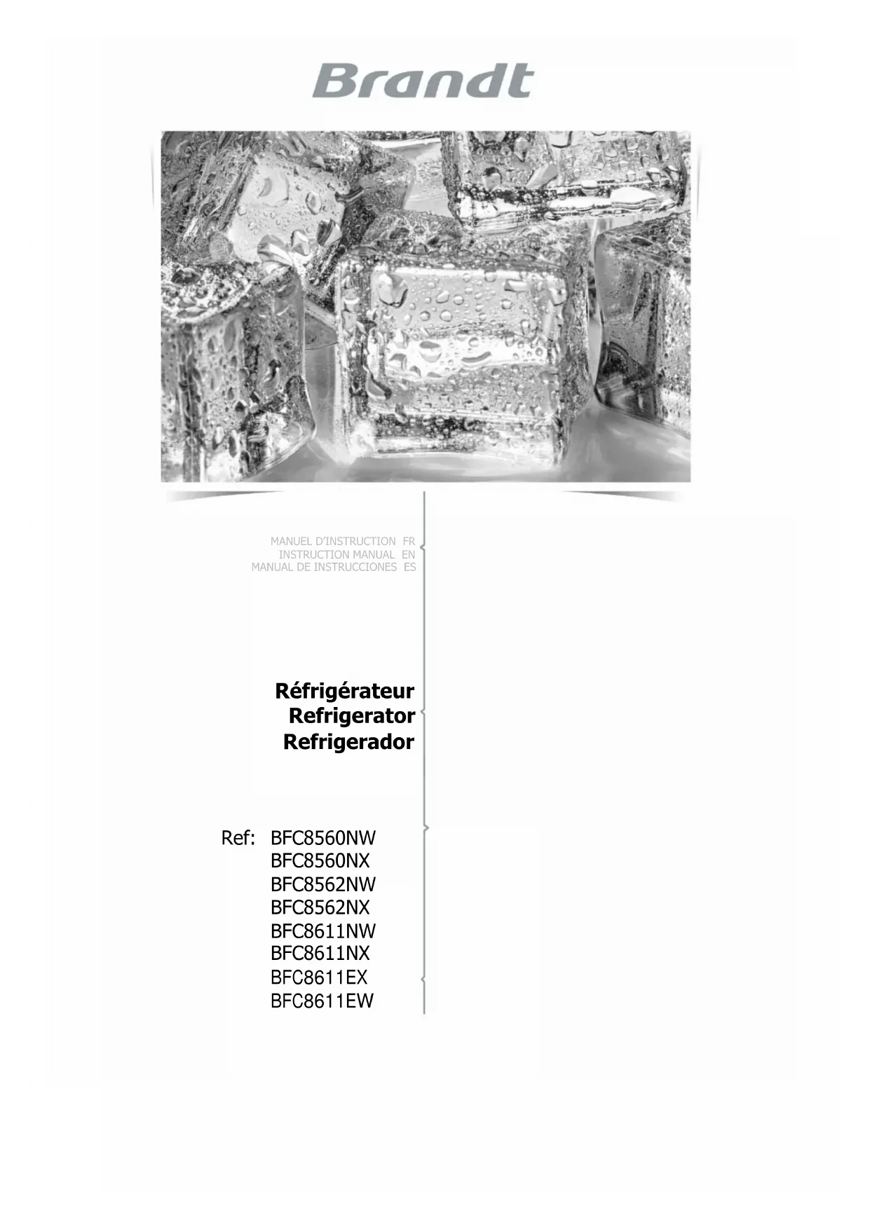Ref: BFC8560NW BFC8560NX BFC8562NW BFC8562NX BFC8611NW BFC8611NX BFC8611EX BFC8611EWChère Cliente, Cher Client, Vous venez d’acquérir un produit BRANDT et nous vous remercions de la confiance que vous nous accordez. Nous avons conçu et fabriqué ce produit en pensant à vous, à votre mode de vie, à vos besoins, pour qu’il réponde au mieux à vos attentes. Nous y avons mis notre savoir-faire, notre esprit d’innovation et toute la passion qui nous anime depuis plus de 60 ans. Dans un souci permanent de toujours mieux satisfaire vos exigences, notre service consommateurs est à votre disposition et à votre écoute pour répondre à toutes vos questions ou suggestions. Connectez-vous aussi sur notre site www.brandt.com où vous trouverez nos dernières innovations, ainsi que des informations utiles et complémentaires. BRANDT est heureux de vous accompagner au quotidien et vous souhaite de profiter pleinement de votre achat.