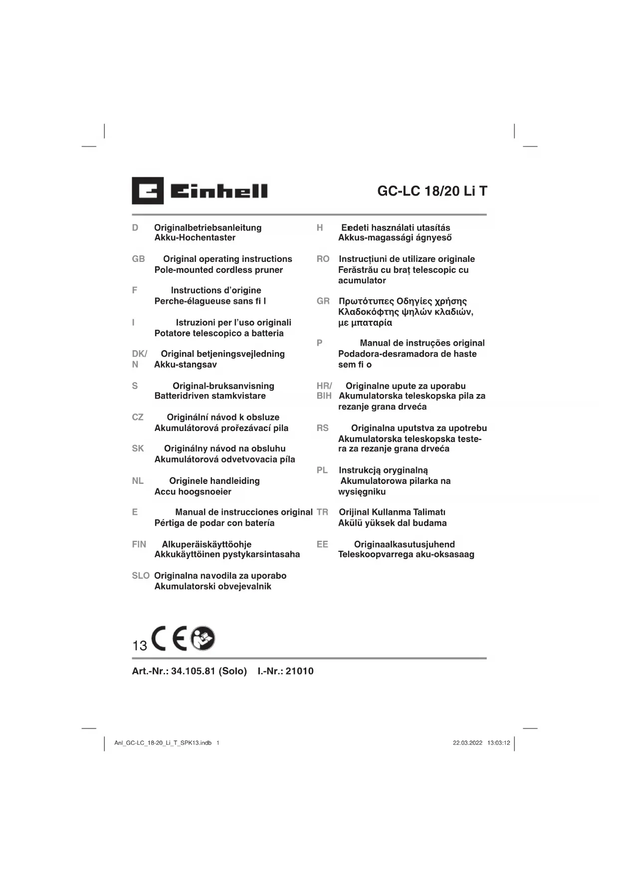 Uniquement pour les pays de l’Union Européenne Ne jetez pas les outils électriques dans les ordures ménagères! Selon la norme européenne 2012/19/CE relative aux appareils électriques et systèmes électroniques usés et selon son application dans le droit national, les outils électriques usés doivent être récoltés à part et apportés à un recyclage respectueux de l’environnement. Possibilité de recyclage en alternative à la demande de renvoi : Le propriétaire de l’appareil électrique est obligé, en guise d’alternative à un envoi en retour, à contribu- er à un recyclage eff ectué dans les règles de l’art en cas de cessation de la propriété. L’ancien appareil peut être remis à un point de collecte dans ce but. Cet organisme devra l’éliminer dans le sens de la Loi sur le cycle des matières et les déchets. Ne sont pas concernés les accessoires et ressources fournies sans composants électroniques. Veuillez noter que lors de la mise au rebut, les accumulateurs et les moyens d’éclairage (par ex. am- poule) sont retirés de l’appareil. Toute réimpression ou autre reproduction de la documentation et des papiers joints aux produits, même sous forme d’extraits, est uniquement permise une fois l’accord explicite de l’Einhell Germany AG obte- nu. Sous réserve de modifi cations techniques Anl_GC-LC_18-20_Li_T_SPK13.indb 42Anl_GC-LC_18-20_Li_T_SPK13.indb 42 22.03.2022 13:03:5622.03.2022 13:03:56F