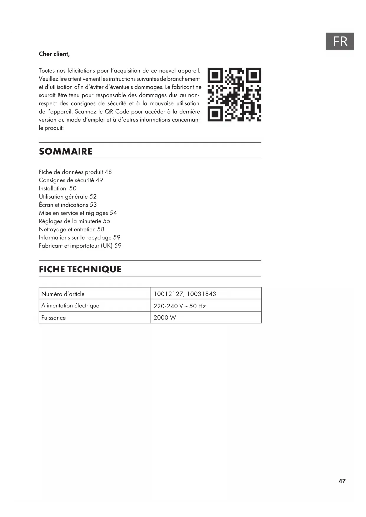Cher client, Toutes nos félicitations pour l’acquisition de ce nouvel appareil. Veuillez lire attentivement les instructions suivantes de branchement et d’utilisation an d’éviter d’éventuels dommages. Le fabricant ne saurait être tenu pour responsable des dommages dus au non- respect des consignes de sécurité et à la mauvaise utilisation de l’appareil. Scannez le QR-Code pour accéder à la dernière version du mode d‘emploi et à d‘autres informations concernant le produit: SOMMAIRE Fiche de données produit48 Consignes de sécurité49 Installation 50 Utilisation générale52 Écran et indications53 Mise en service et réglages54 Réglages de la minuterie55 Nettoyage et entretien58 Informations sur le recyclage59 Fabricant et importateur (UK)59 FICHE TECHNIQUE Numéro d’article 10012127, 10031843 Alimentation électrique 220-240 V ~ 50 Hz Puissance 2000 W48