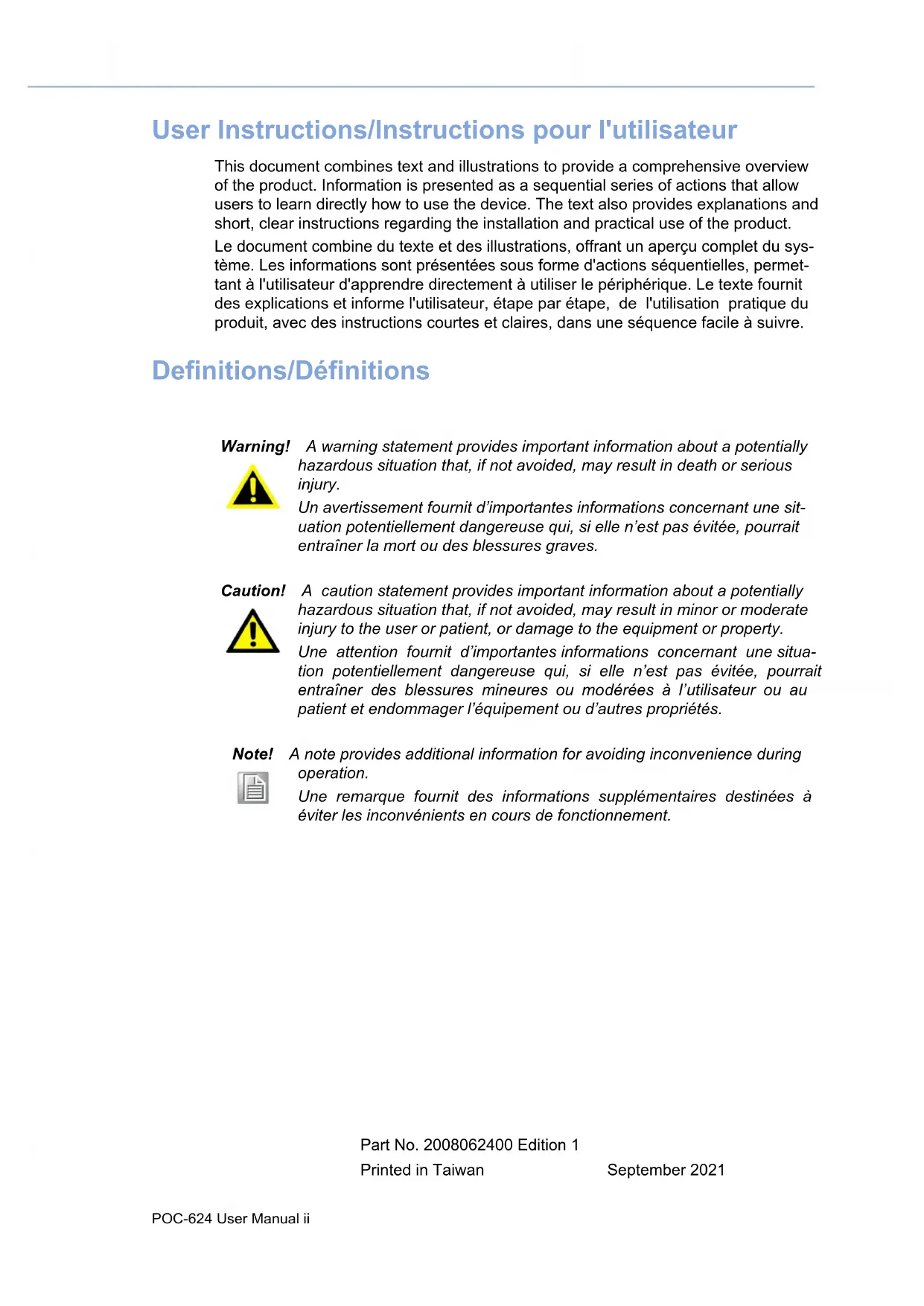 User Manual POC-624 Series 23.8” Point-of-Care Terminal with Intel® Core™ i7/i5/i3/ Celeron® ProcessorPOC-624 User Manual ii User Instructions/Instructions pour l'utilisateur This document combines text and illustrations to provide a comprehensive overview of the product. Information is presented as a sequential series of actions that allow users to learn directly how to use the device. The text also provides explanations and short, clear instructions regarding the installation and practical use of the product. Le document combine du texte et des illustrations, offrant un aperçu complet du sys- tème. Les informations sont présentées sous forme d'actions séquentielles, permet- tant à l'utilisateur d'apprendre directement à utiliser le périphérique. Le texte fournit des explications et informe l'utilisateur, étape par étape, de l'utilisation pratique du produit, avec des instructions courtes et claires, dans une séquence facile à suivre. Definitions/Définitions Warning! A warning statement provides important information about a potentially hazardous situation that, if not avoided, may result in death or serious injury. Un avertissement fournit d’importantes informations concernant une sit- uation potentiellement dangereuse qui, si elle n’est pas évitée, pourrait entraîner la mort ou des blessures graves. Caution! A caution statement provides important information about a potentially hazardous situation that, if not avoided, may result in minor or moderate injury to the user or patient, or damage to the equipment or property. Une attention fournit d’importantes informations concernant une situa- tion potentiellement dangereuse qui, si elle n’est pas évitée, pourrait entraîner des blessures mineures ou modérées à l’utilisateur ou au patient et endommager l’équipement ou d’autres propriétés. Note! A note provides additional information for avoiding inconvenience during operation. Une remarque fournit des informations supplémentaires destinées à éviter les inconvénients en cours de fonctionnement. Part No. 2008062400 Edition 1 Printed in Taiwan September 2021iii POC-624 User Manual Safety Instructions
