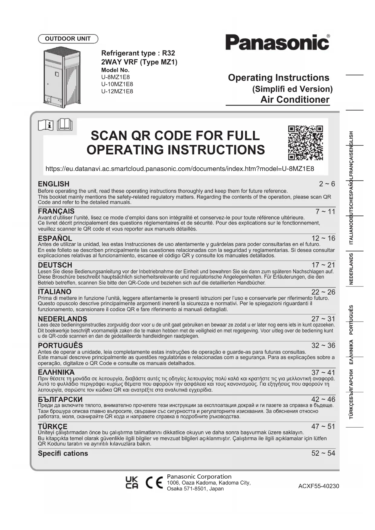Troubleshooting Refer to the Operating Instructions attached to the indoor unit. 00360620all.indb600360620all.indb6 2024/06/249:31:312024/06/249:31:317 FRANÇAISNous vous remercions d’avoir fait l’acquisition de ce produit Panasonic.Ce produit est une unité extérieure de climatiseur commercial.Instructions d’installation jointes. Précautions de sécurité Les symboles suivants utilisés dans ce manuel vous avertissent de conditions potentiellement dangereuses pour les utilisateurs, le personnel du SAV ou l’appareil : AVERTISSEMENT Ce symbole signale un danger ou une pratique dangereuse pouvant provoquer des blessures graves voire mortelles. PRÉCAUTION Ce symbole signale un danger ou une pratique dangereuse pouvant provoquer des dégâts physiques ou matériels.Interdictions Points à observer• Lisez attentivement ce mode d’emploi avant d’utiliser le climatiseur. En cas de diffi cultés ou de problèmes, demandez de l’aide à votre revendeur.• Ce climatiseur est conçu pour vous donner des conditions ambiantes confortables. Ne l’utilisez que pour le but prévu comme décrit dans ce mode d’emploi.• « QR Code » est une marque déposée de DENSO WAVE INCORPORATED. Confi rmez auprès d’un revendeur agréé ou d’un spécialiste le type de réfrigérant spécifi é à utiliser. L’utilisation d’un réfrigérant autre que celui spécifi é peut provoquer des dommages matériels, des brûlures et des blessures, etc. Ce climatiseur ne comporte pas d’aérateur pour l’admission d’air frais de l’extérieur. Vous devez ouvrir les portes ou les fenêtres fréquemment quand vous utilisez des appareils de chauff age à gaz ou à pétrole dans la même pièce, qui consomment beaucoup d’oxygène de l’air. Autrement il y a risque d’asphyxie dans un cas extrême. N’utilisez jamais ni ne rangez de l’essence ou tout autre gaz ou liquide infl ammable près du climatiseur — cela est très dangereux. N’utilisez pas cet appareil dans une atmosphère potentiellement explosive. Ne touchez jamais l’unité avec les mains mouillées. N’insérez pas vos doigts ou d’autres objets dans l’unité intérieure ou extérieure du climatiseur. Les pièces en rotation peuvent présenter un risque de blessure. AVERTISSEMENT AVERTISSEMENTCe symbole indique que cet équipement utilise un réfrigérant inflammable. En présence d’une source d’ignition externe, une fuite de réfrigérant peut provoquer un départ de feu.PRÉCAUTIONCe symbole indique que l’équipement doit être manipulé par un technicien après-vente, qui se reportera au Manuel technique.PRÉCAUTIONCe symbole indique que des informations sont incluses dans le mode d’emploi et/ou les instructions d’installation.Informations importantes à propos du réfrigérant utilisé Ce produit contient des gaz à eff et de serre fl uorés. N’évacuez pas des gaz dans l’atmosphère.Type de réfrigérant: R32Valeur GWP (1) : 675 (1) GWP =global warming potential (Potentiel de Réchauff ement Global)Des vérifi cations périodiques d’absence de fuites peuvent être nécessaires en fonction de la législation européenne ou locale. Contactez votre revendeur local pour plus d’informations. 00360620all.indb700360620all.indb7 2024/06/249:31:312024/06/249:31:318 Si le réfrigérant entre en contact avec une fl amme, cela peut produire des gaz toxiques. Pour des raisons de sécurité, assurez- vous que le climatiseur est hors tension et coupez également le courant avant le nettoyage ou l’entretien. Débranchez la fi che du cordon d’alimentation électrique de la prise, mettez le disjoncteur hors tension ou encore coupez le dispositif de sectionnement en vue d’isoler le climatiseur de l’alimentation secteur en cas d’urgence. Mettez au rebut conformément aux lois nationales et/ou locales. Ce produit ne doit en aucune circonstance être modifi é ou démonté. Une unité modifi ée ou démontée peut provoquer un incendie, une électrocution ou des blessures. Ne nettoyez pas l’intérieur des unités intérieure et extérieure vous-même. Demandez à un revendeur agréé ou à un spécialiste de se charger du nettoyage. En cas de dysfonctionnement de cet appareil, ne le réparez pas vous-même. Prenez contact avec le revendeur ou un SAV pour la réparation et la mise au rebut. Prévoyez une prise électrique à utiliser exclusivement pour chaque unité, et prévoyez un dispositif de déconnexion de l’alimentation électrique, un disjoncteur de fuite à la terre ou un dispositif diff érentiel à courant résiduel pour la protection contre surintensité de courant dans la ligne exclusive. Prévoyez une prise électrique à utiliser exclusivement pour chaque unité. Une séparation des contacts au moyen d’une déconnexion complète dans tous les pôles doit en outre est incorporée dans le câblage fi xe conformément aux règles de câblage. Pour éviter les risques possibles d’une défaillance de l’isolation, l’unité doit être mise à la terre. AVERTISSEMENT N’utilisez pas un cordon modifi é, un cordon commun, une rallonge ou un cordon non spécifi é afi n de prévenir une surchauff e ou un incendie. L’appareil doit être rangé dans une pièce sans sources d’ignition utilisées en continu (par exemple : fl ammes nues, appareil à gaz en marche ou chauff age électrique en marche). Attention, certains réfrigérants ne contiennent pas d’agent odorant. Un endroit non ventilé où l’appareil est installé doit être construit de telle sorte qu’en cas de fuite du réfrigérant, celui-ci ne stagnera pas afi n d’éviter tout risque d’incendie ou d’explosion. L’appareil doit être rangé dans un endroit où la taille de la pièce correspond à la surface de la pièce tel que spécifi é pour le fonctionnement. Après avoir installé l’unité, demandez impérativement à l’installateur l’espace au sol de la pièce où l’unité est installée et la quantité de 
