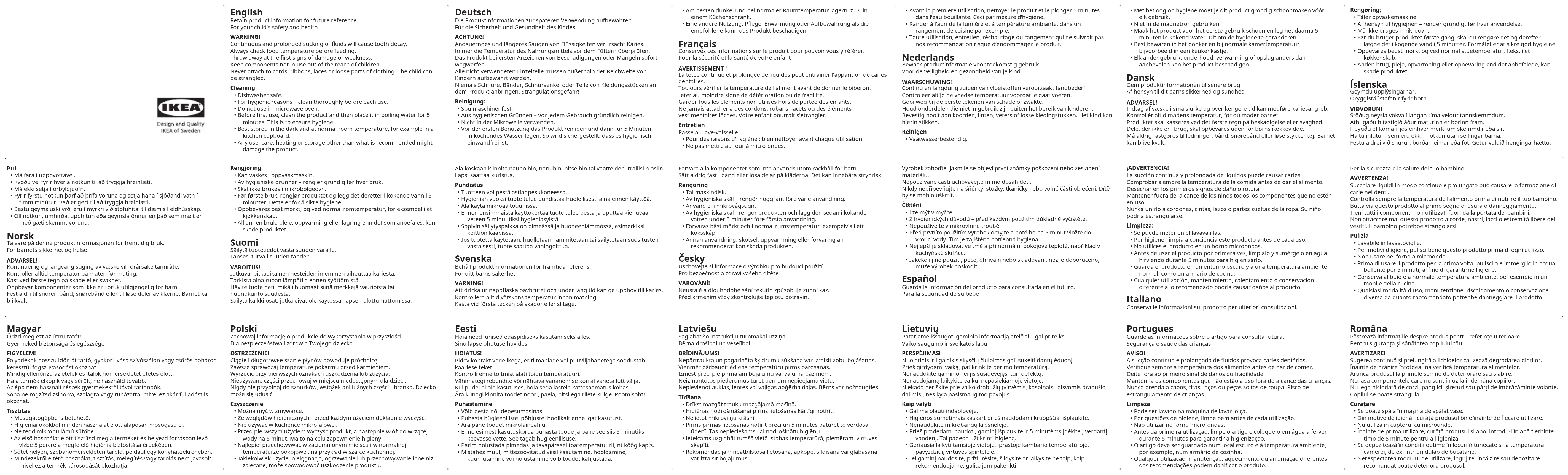 - Eine andere Nutzung, Pege, Erwärmung oder Aufbewahrung als die empfohlene kann das Produkt beschädigen. Français Conservez ces informations sur le produit pour pouvoir vous y référer. Pour la sécurité et la santé de votre enfant AVERTISSEMENT ! La tétée continue et prolongée de liquides peut entraîner l'apparition de caries dentaires. Toujours vérier la température de l'aliment avant de donner le biberon. Jeter au moindre signe de détérioration ou de fragilité. Garder tous les éléments non utilisés hors de portée des enfants. Ne jamais attacher à des cordons, rubans, lacets ou des éléments vestimentaires lâches. Votre enfant pourrait s'étrangler. Entretien Passe au lave-vaisselle.