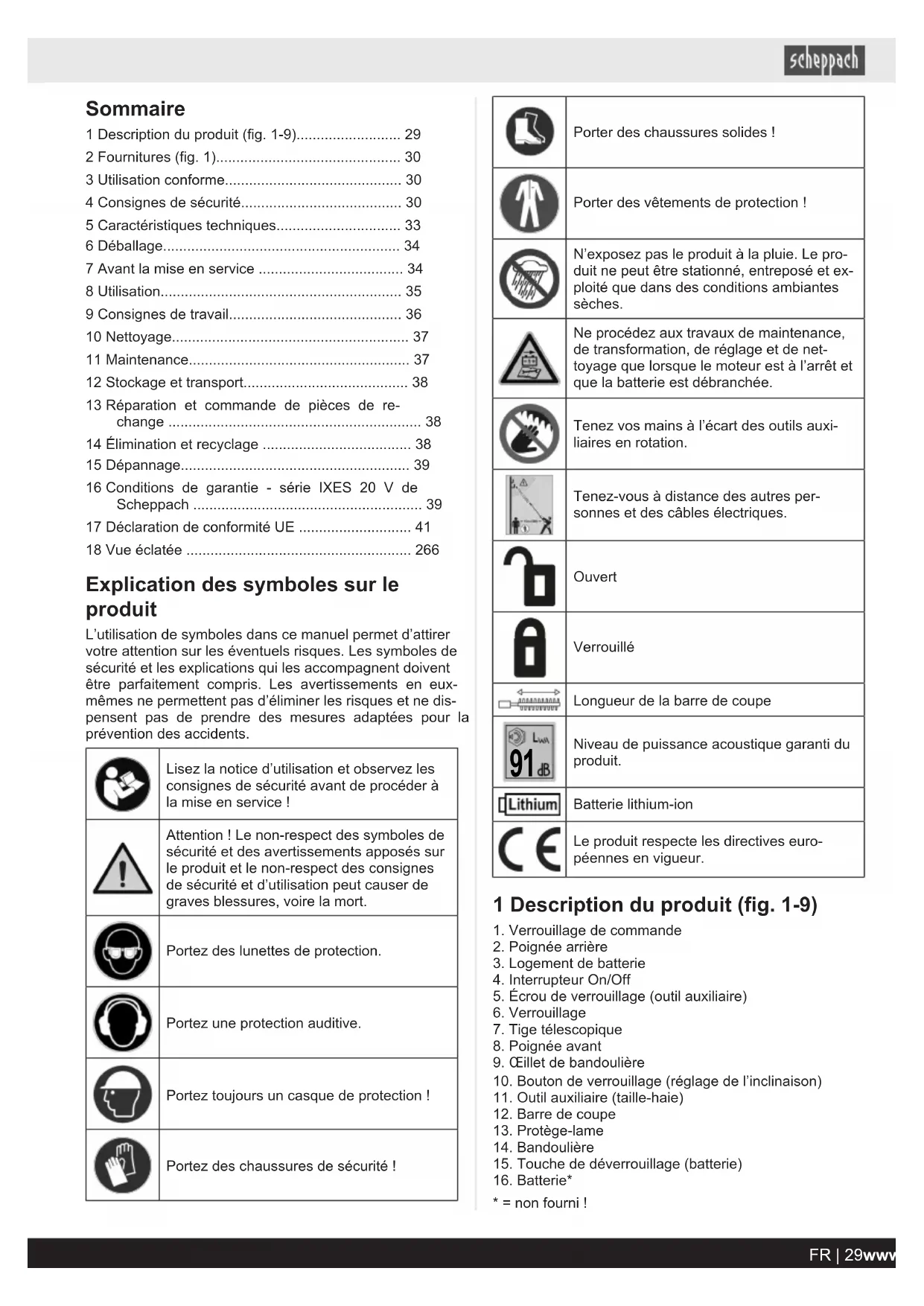 - Documentation authorised representative: David Rümpelein Günzburger Str. 69 D-89335 Ichenhausen Ichenhausen, 27.06.2024 Simon Schunk Division Manager Product Center Andreas Pecher Head of Project Management 28 | GB www.scheppach.comSommaire 1 Description du produit (fig.1-9) p. 29