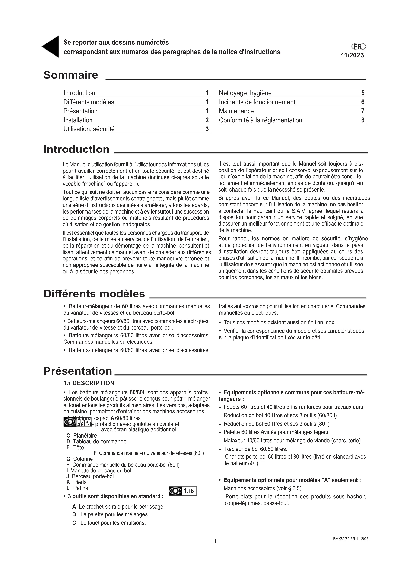 - Equipements optionnels pour modèles "A" seulement : - Machines accessoires (voir § 3.5). - Porte-plats pour la réception des produits sous hachoir, coupe-légumes, passe-tout. 1.1b Sommaire Introduction 1 Diérents modèles 1 Présentation 1 Installation 2 Utilisation, sécurité 3 Nettoyage, hygiène 5 Incidents de fonctionnement 6 Maintenance 7 Conformité à la réglementation 8