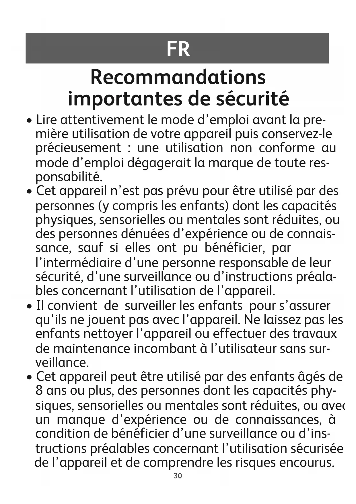 - Cet appareil n’est pas prévu pour être utilisé par des personnes (y compris les enfants) dont les capacités physiques, sensorielles ou mentales sont réduites, ou des personnes dénuées d’expérience ou de connais- sance, sauf si elles ont pu bénéficier, par l’intermédiaire d’une personne responsable de leur sécurité, d’une surveillance ou d’instructions préala- bles concernant l’utilisation de l’appareil.